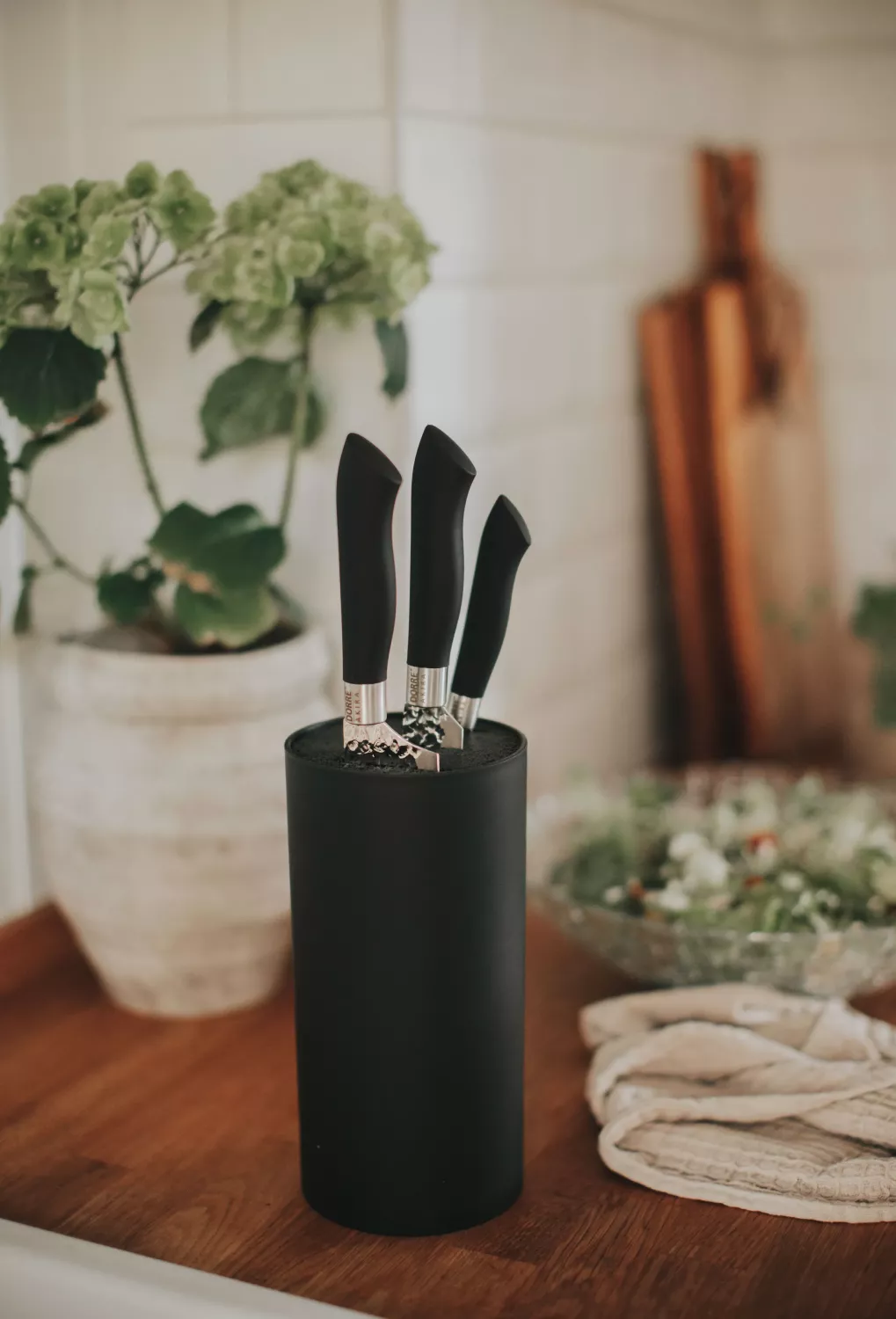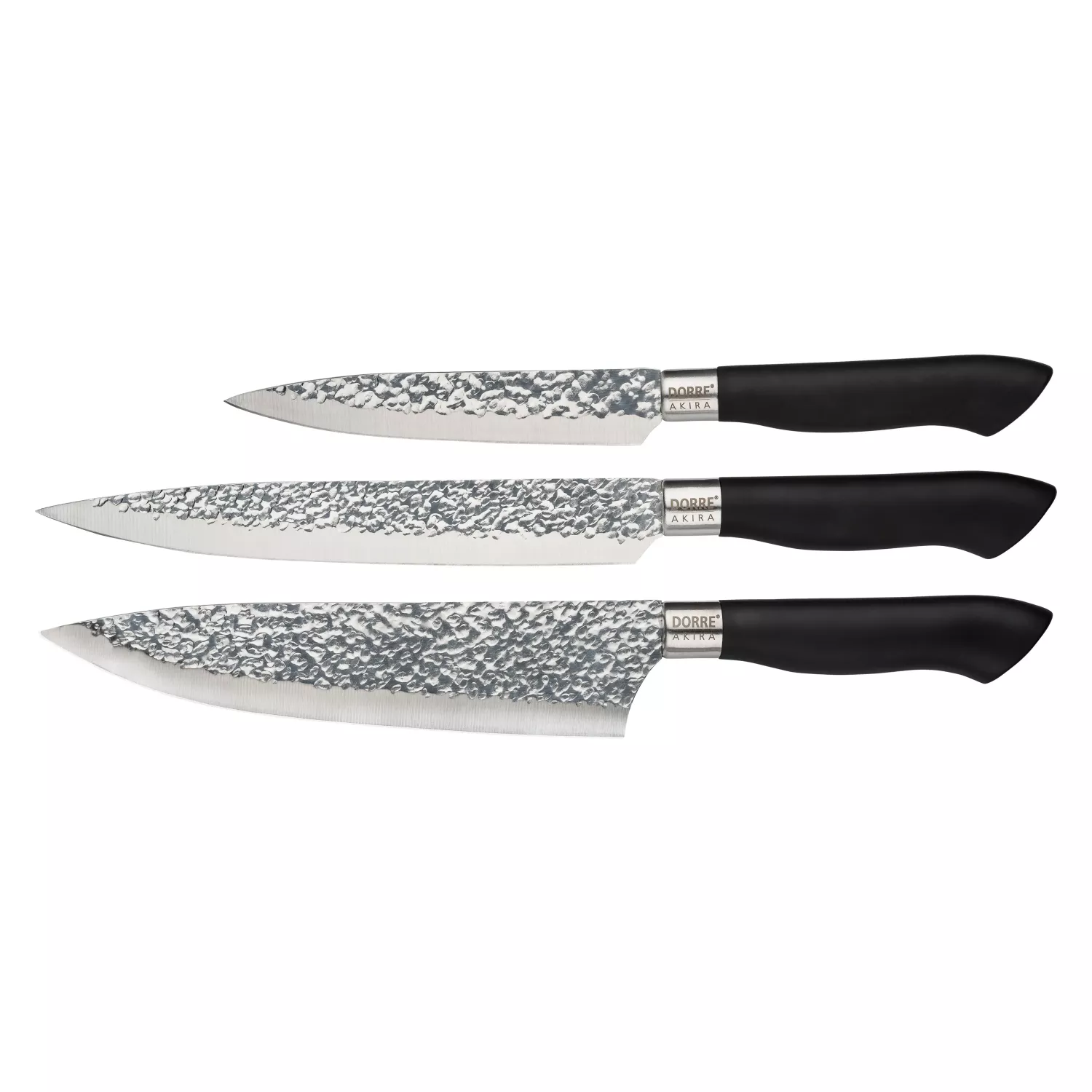 Akira knivset från Dorre innehåller rostfria knivar med plasthandtag i trämönster – perfekt för kökets vanligaste uppgifter.
