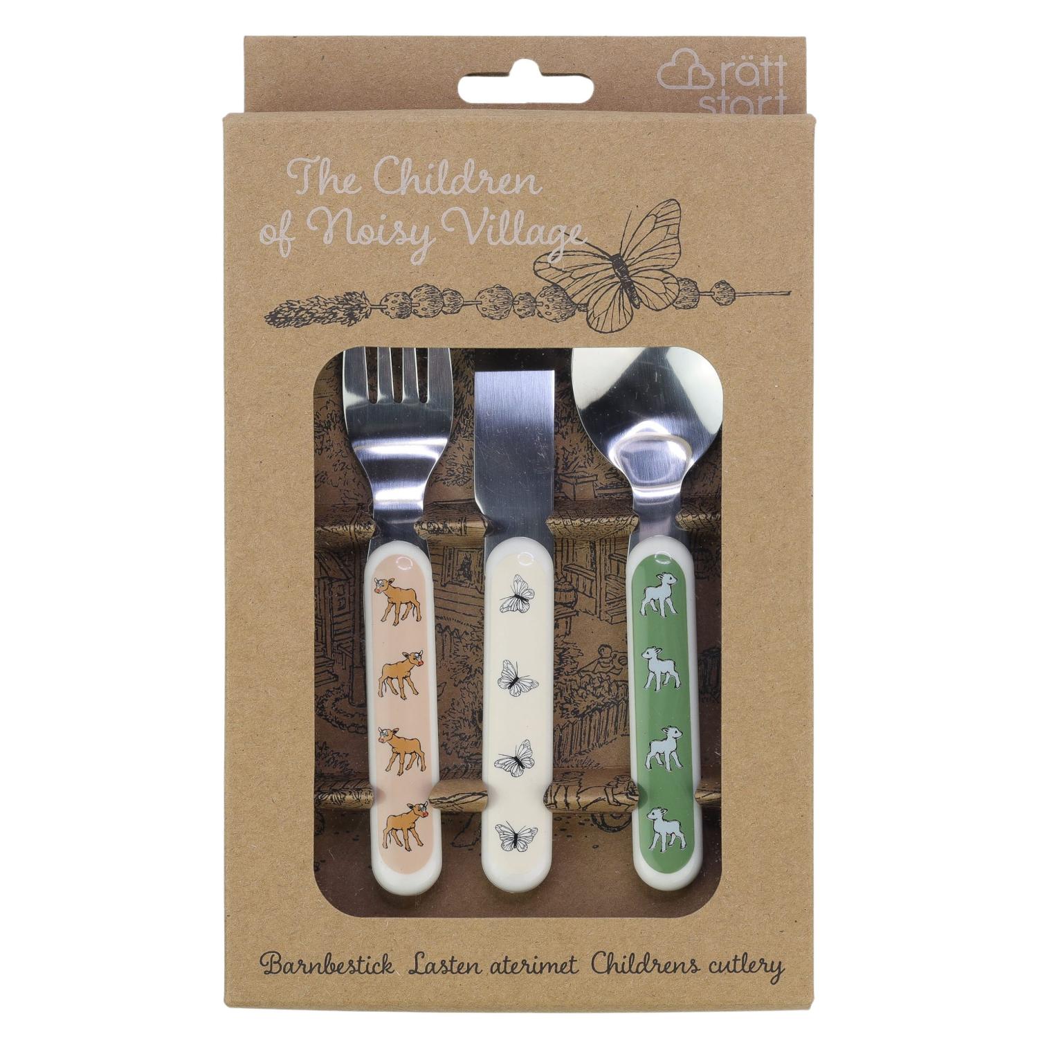 Barnbestick Bullerbyn 3 delar från Rätt Start. Med Ilon Wiklands motiv, perfekt för små händer. Levereras i fin presentkartong.