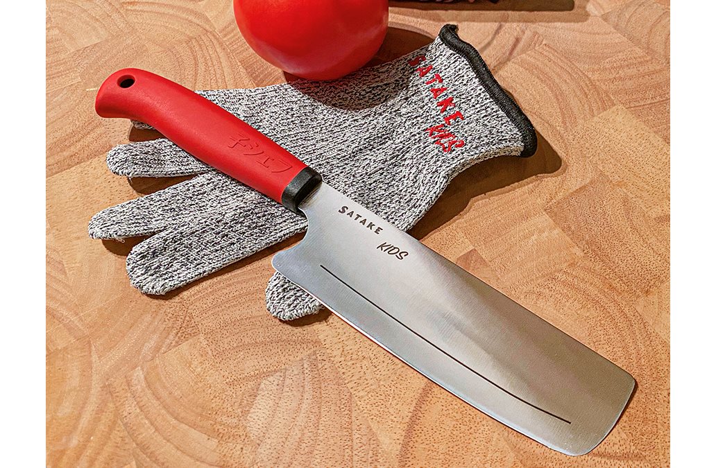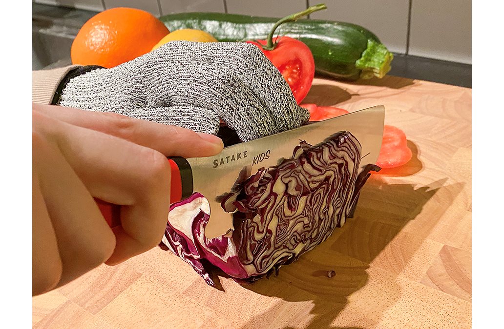 Barnkniv och skärsäker vante i presentlåda. Säker design med Nakiri-inspiration, greppvänligt handtag och maskintvättbar skyddshandske.