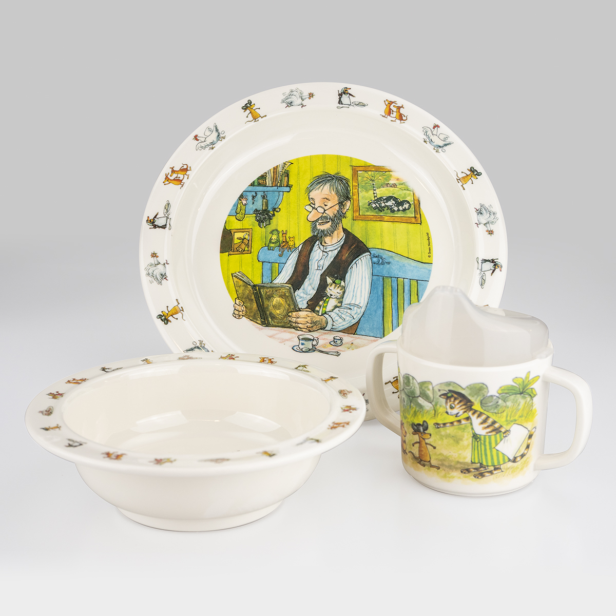 Lätt och tålig barnservis i tre delar med motiv av Pettson och Findus.