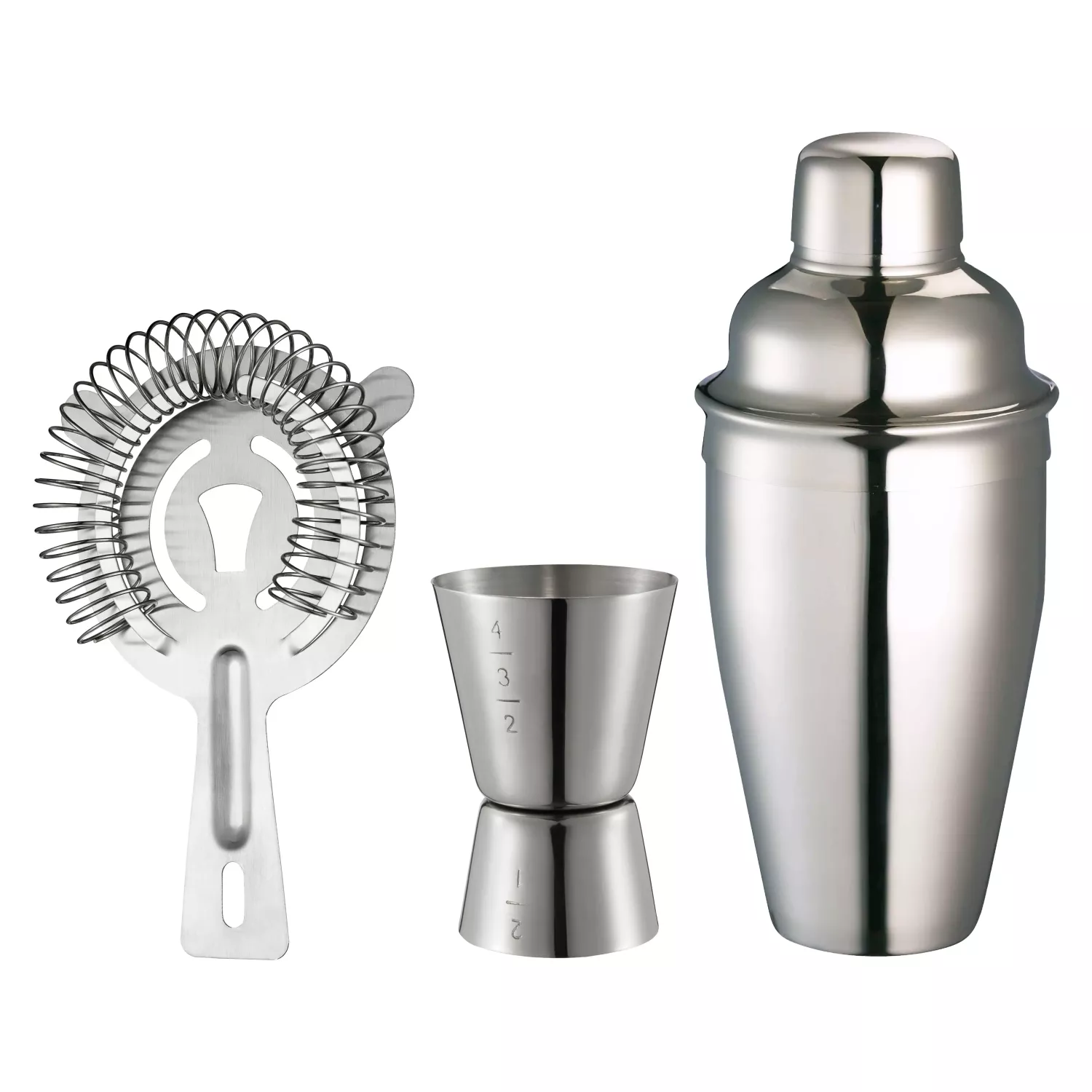 Barset i 3 delar: Skaker som rymmer 5 dl, vändbart drinkmått 1-4 cl och drinksil.
