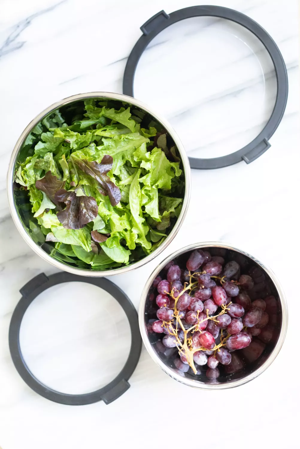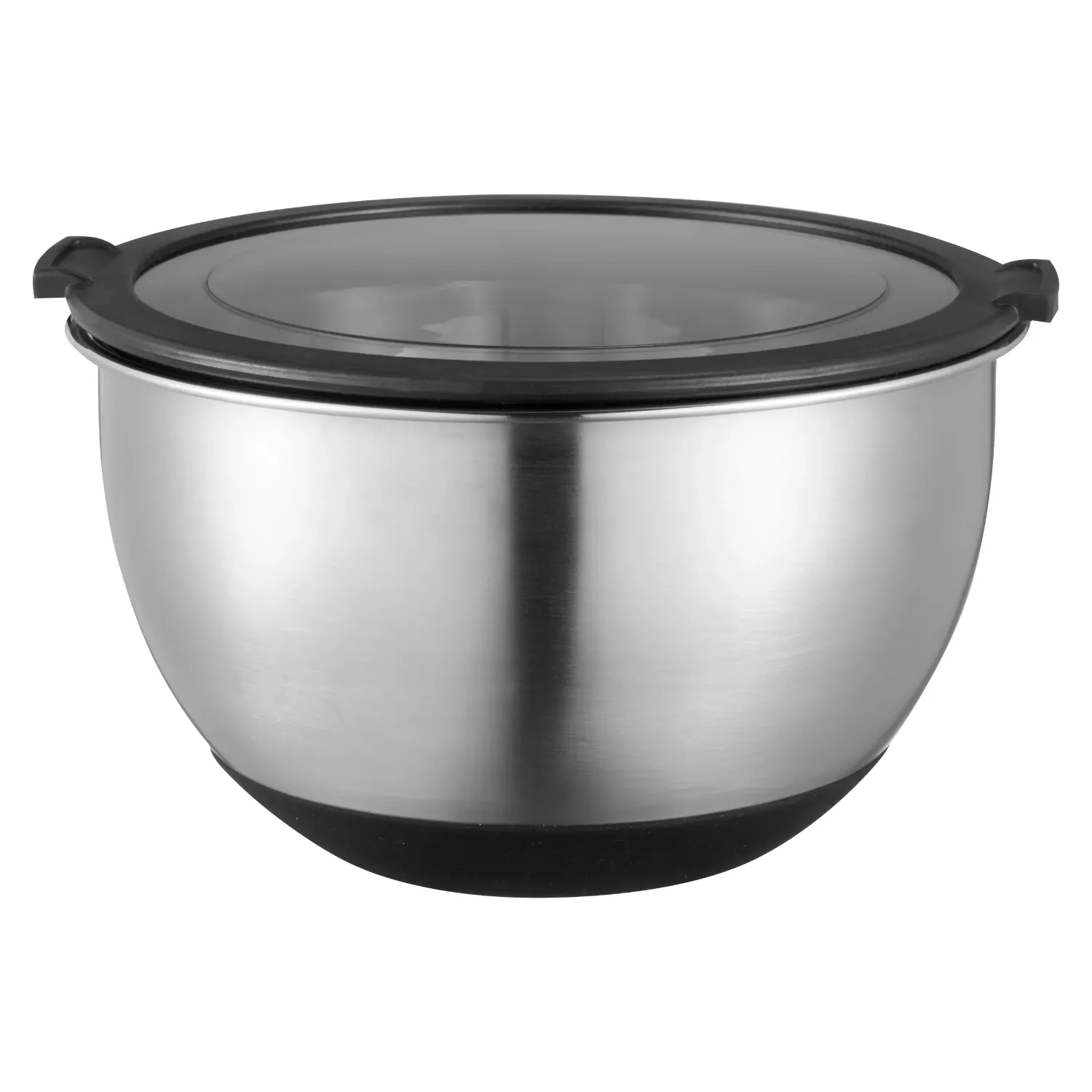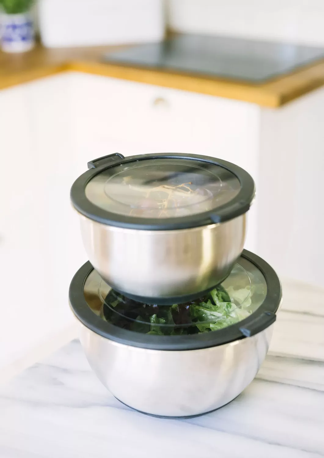 Set med två skålar i borstat rostfritt stål med plastlock. Perfekta för bakning, matlagning och förvaring av matrester.