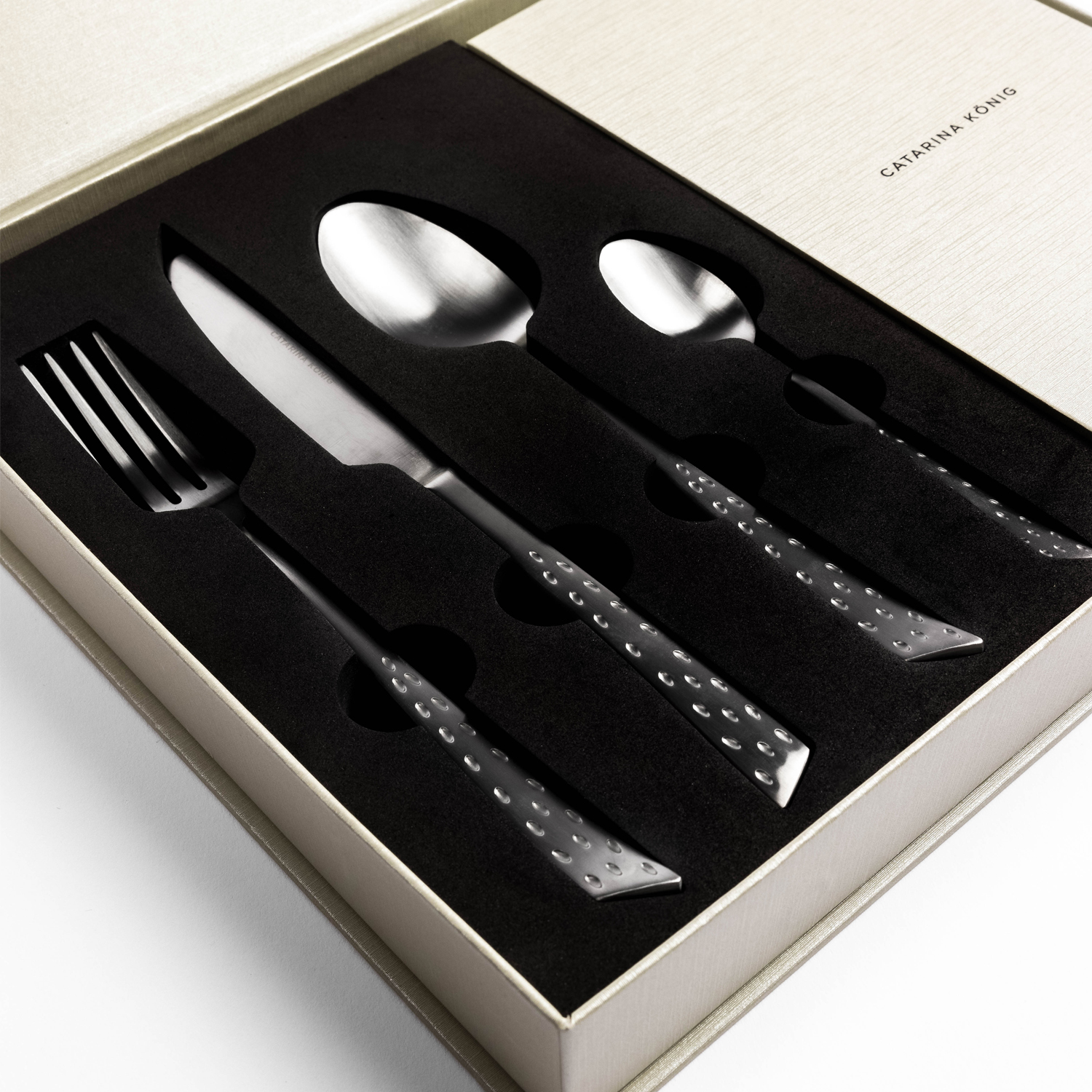 Besticken är tillverkade i rostfritt stål av hög kvalitet i matt borstad finish med en elegant design som sätter lite extra guldkant till din nästa dukning. Tål maskindisk. Setet är för 6 personer och levereras i en exklusiv presentkartong.