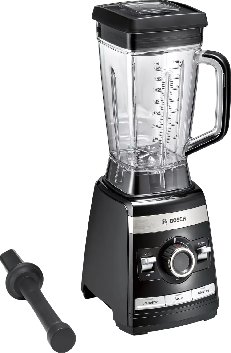 Bosch VitaBoost blender – stamper för trög/fryst mix, steglös fart, puls & 3 program (smoothie, soppa, rengöring). 2 L kanna med mått.