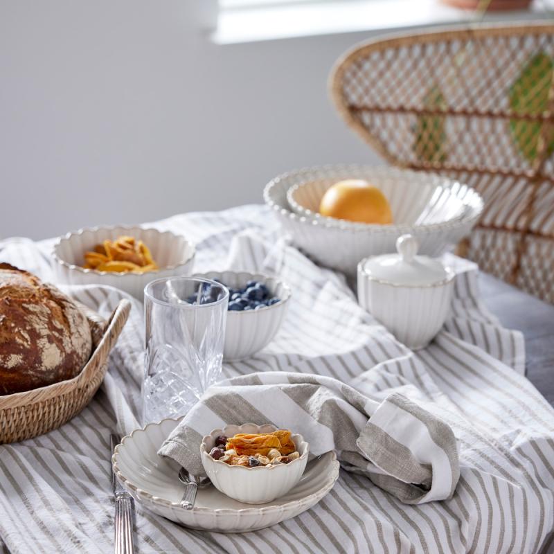 Skålen är tillverkad av högkvalitativt porslin och passar lika bra till formella middagar som till mysiga vardagsmåltider. Den tidlösa designen i mjuka nyanser av elfenben och beige ger en harmonisk känsla som förhöjer dukningen.