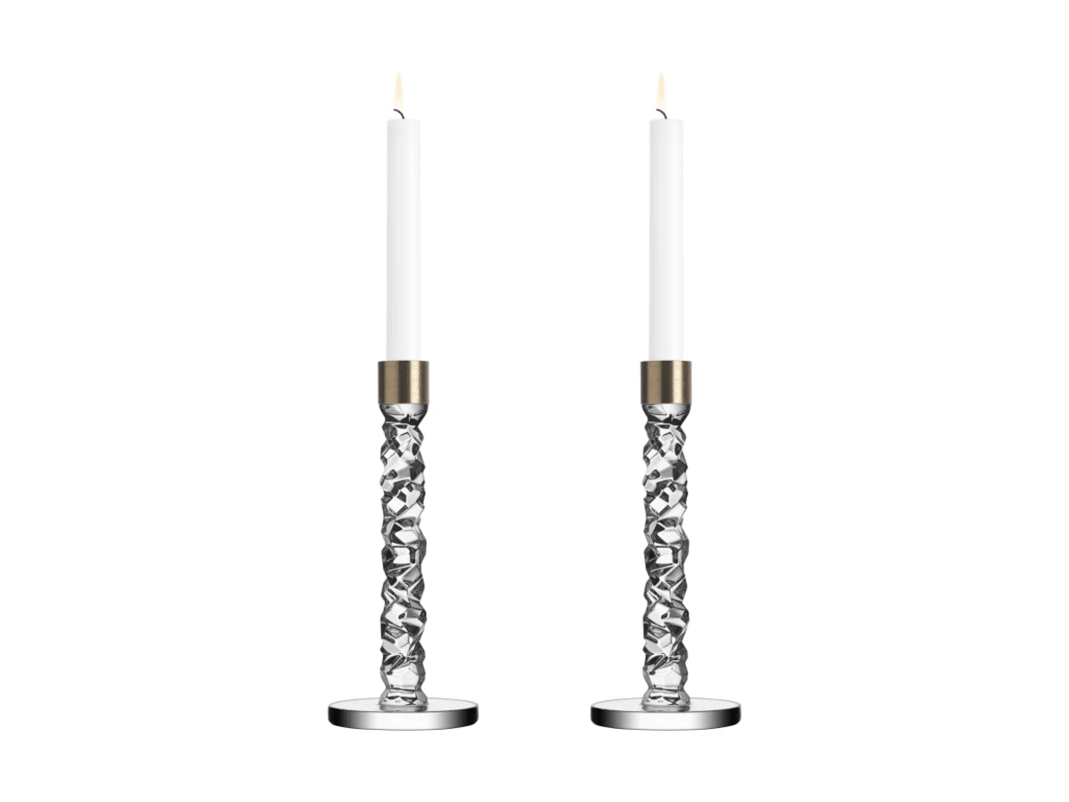 Orrefors ljusstake Carat är detaljen som sätter pricken över i. De oregelbundna slipningarna gnistrar som diamanter och bidrar till en lyxig känsla i vilket rum som helst. Orrefors ljusstake Carat för tankarna till slipade diamanter eller kristaller som ställs på varandra. Formgivaren Lena Bergström har de senaste åren inspirerats av juveler och ädelstenar. Det kan man tydligt se i ljusstaken Carat som hon har designat för Orrefors, där hon har skapat ett alldeles unikt uttryck med hjälp av ny teknik. Resultatet är en exklusiv ljusstake som verkligen inte ber om ursäkt – en ljusstake designad precis i Orrefors stil. Orrefors ljusstake Carat är 24,2 cm hög och säljs i 2-pack. De finns i olika varianter, välj den som passar dig bäst. Vill man att ljusstaken med mässingdetalj ska behålla den högglansiga ytan är det bra att putsa den med jämna mellanrum då den annars får en patina och mörknar med tiden.
