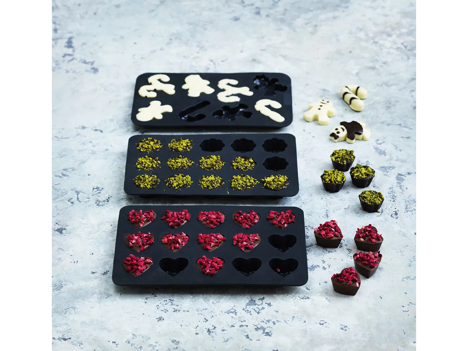 Chokladformar i grått silikon med tre olika teman så att du kan forma de finaste, små chokladfigurer.