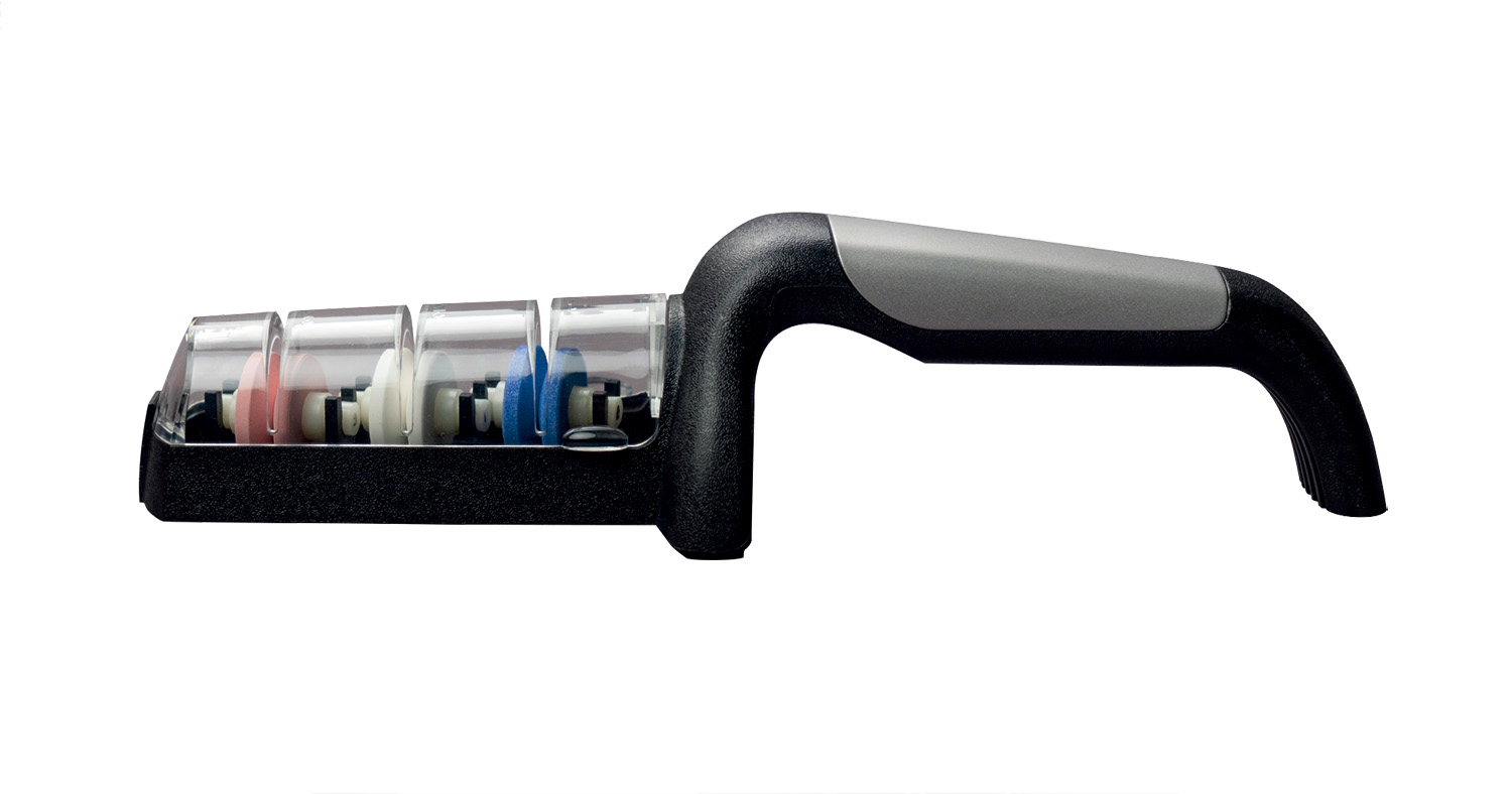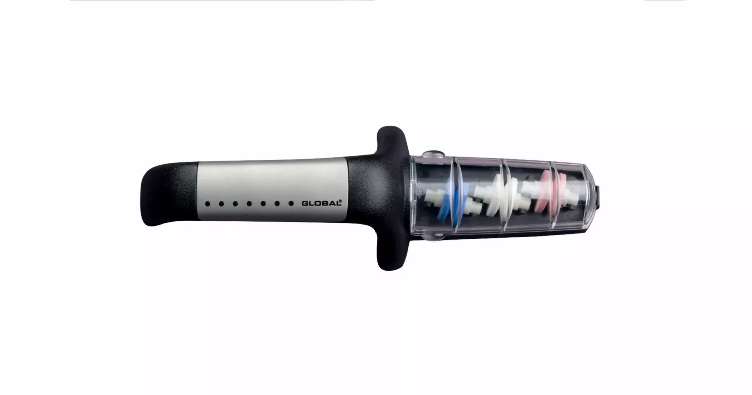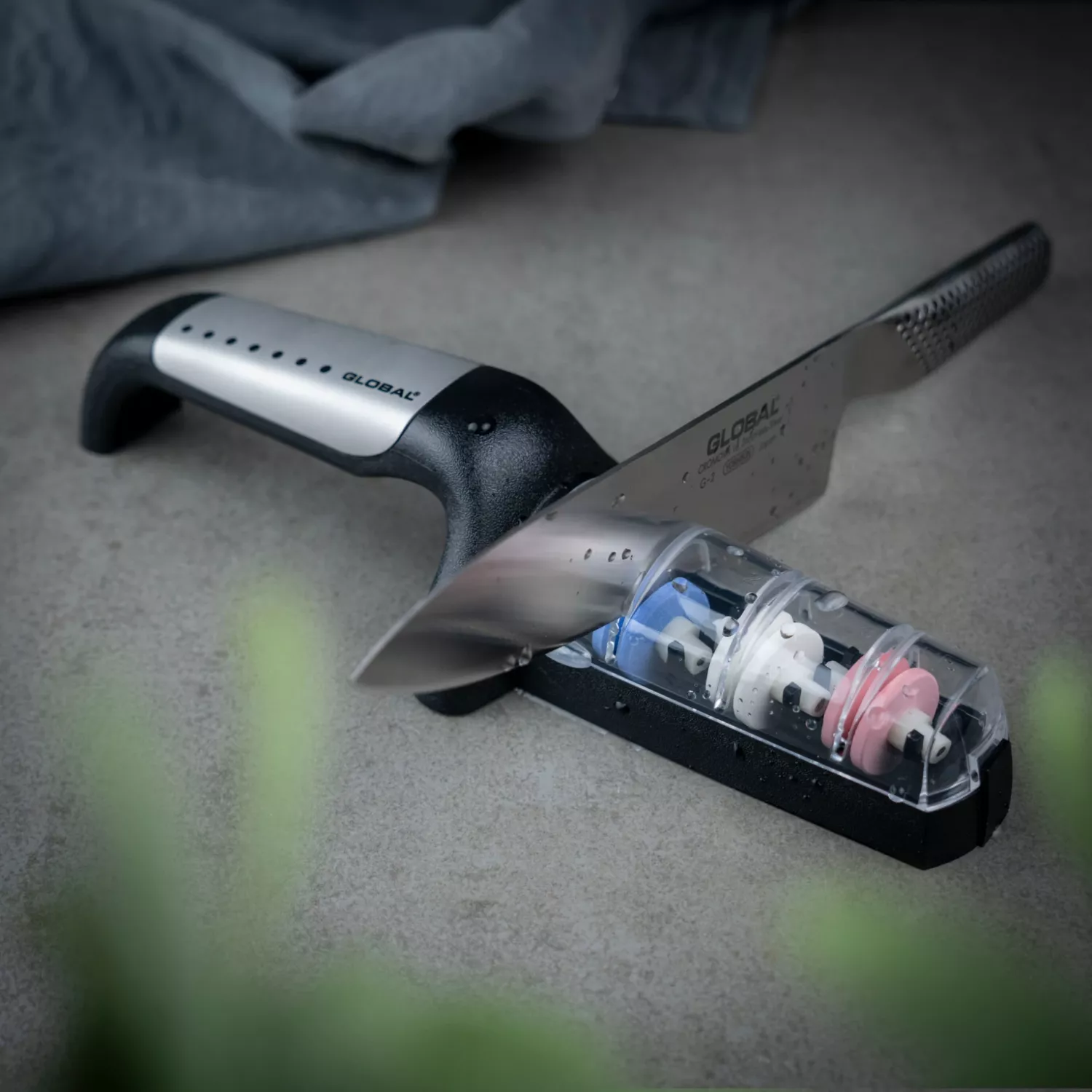 Håll efter dina köksknivar genom att då och då skärpa dem med Globals våtslip. Allt du behöver göra är att fylla knivslipen med lite vatten och dra några drag med kniven igenom de olika hjulen, så blir skärpan som ny. Våtslipen har sliphjul i tre olika grovlekar: grov (120 i kornstorlek), medelgrov (240 i kornstorlek) och fin (600 i kornstorlek). Hjulen fyller olika funktioner. Det grova hjulet används för att slipa fram en ny, vass egg på slöa knivar. För underhållning av skärpan används det medelgrova, följt av det fina sliphjulet.