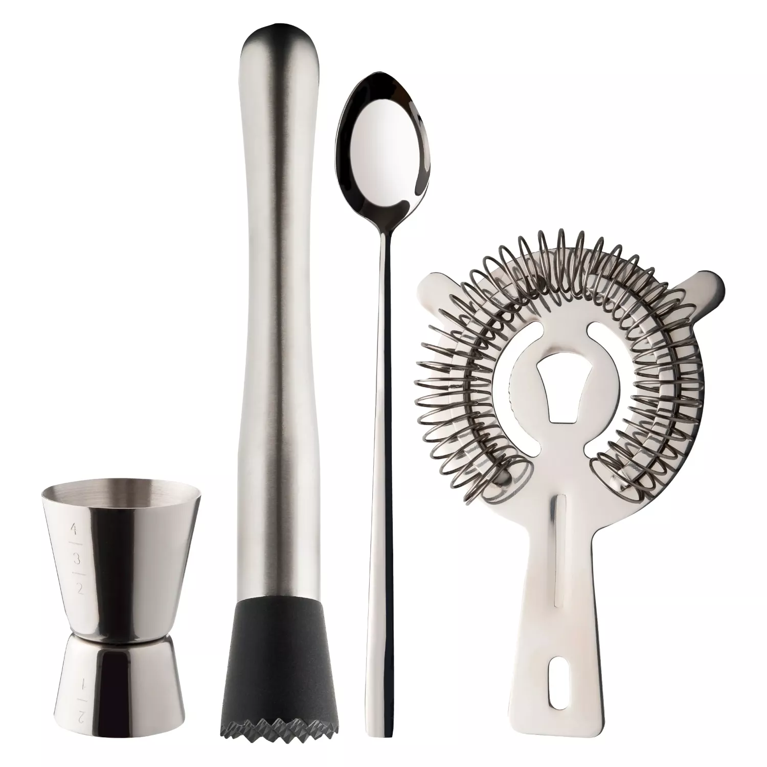 Komplett barset i rostfritt stål – shaker, sil, mått och sked för proffsiga drinkar hemma.