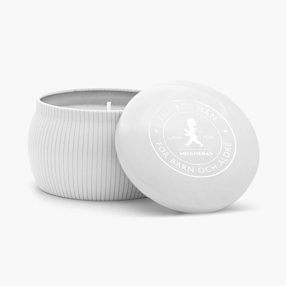 Doftljus i plåt från Solstickan – matchar tändsticksrören. Tillverkat av 100 % sojavax. Ca 25 timmars brinntid.