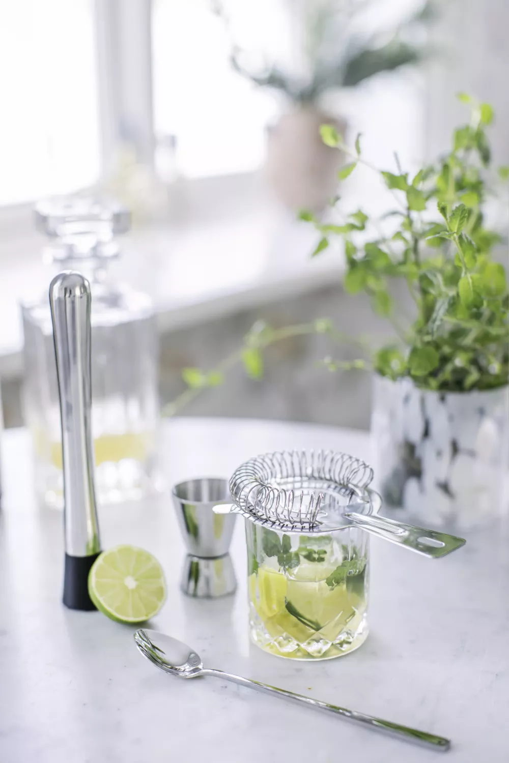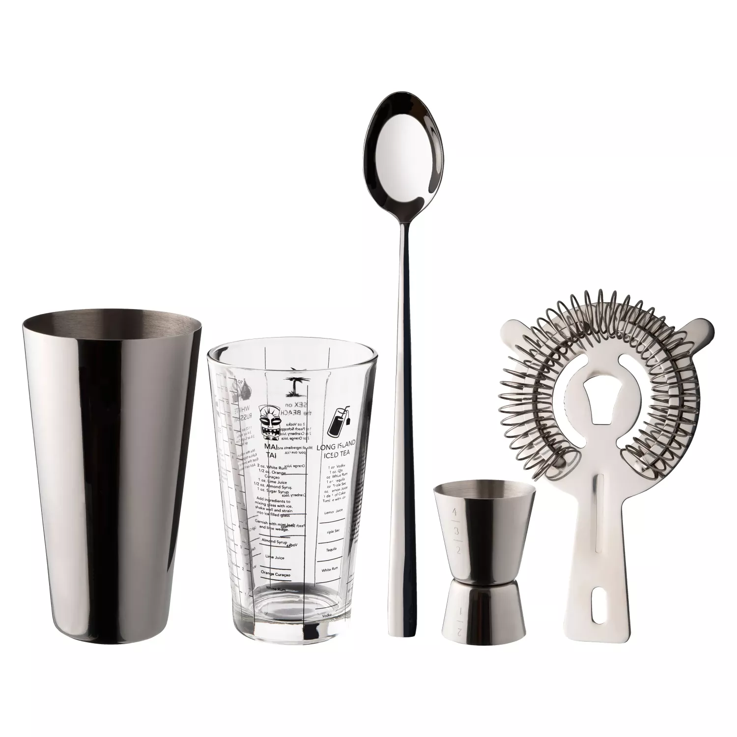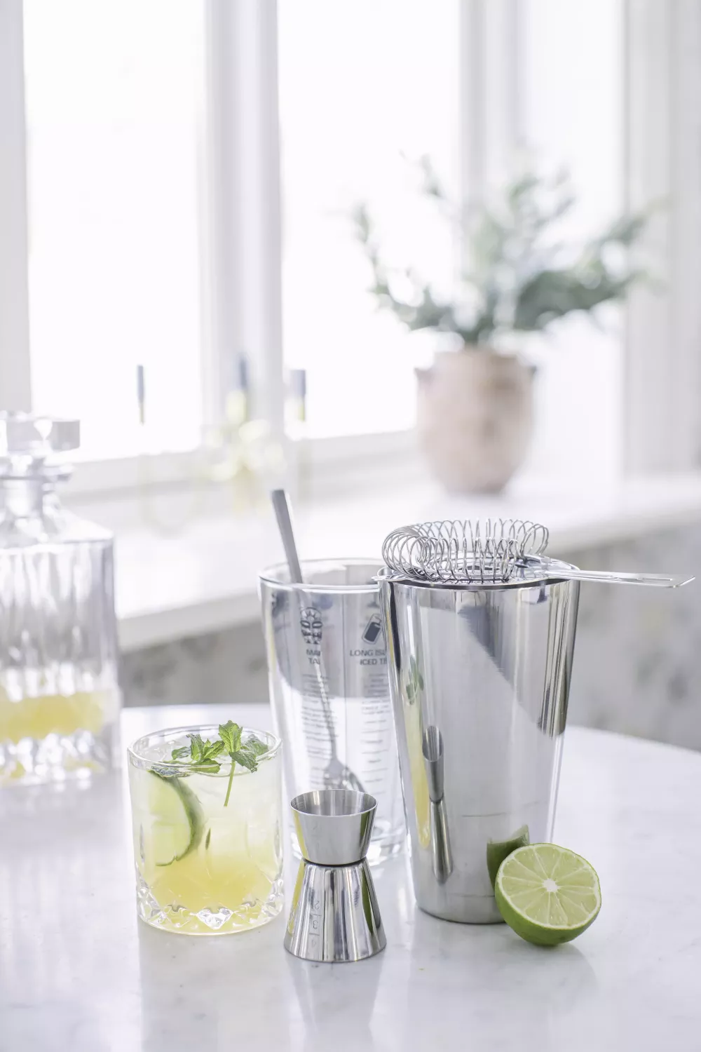 Komplett barset för hemmabaren – shaker, sil och mätglas i praktiskt förvar.