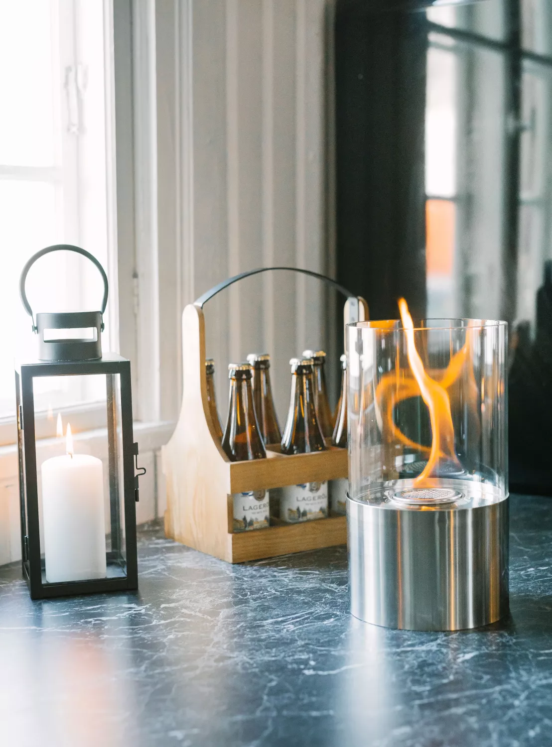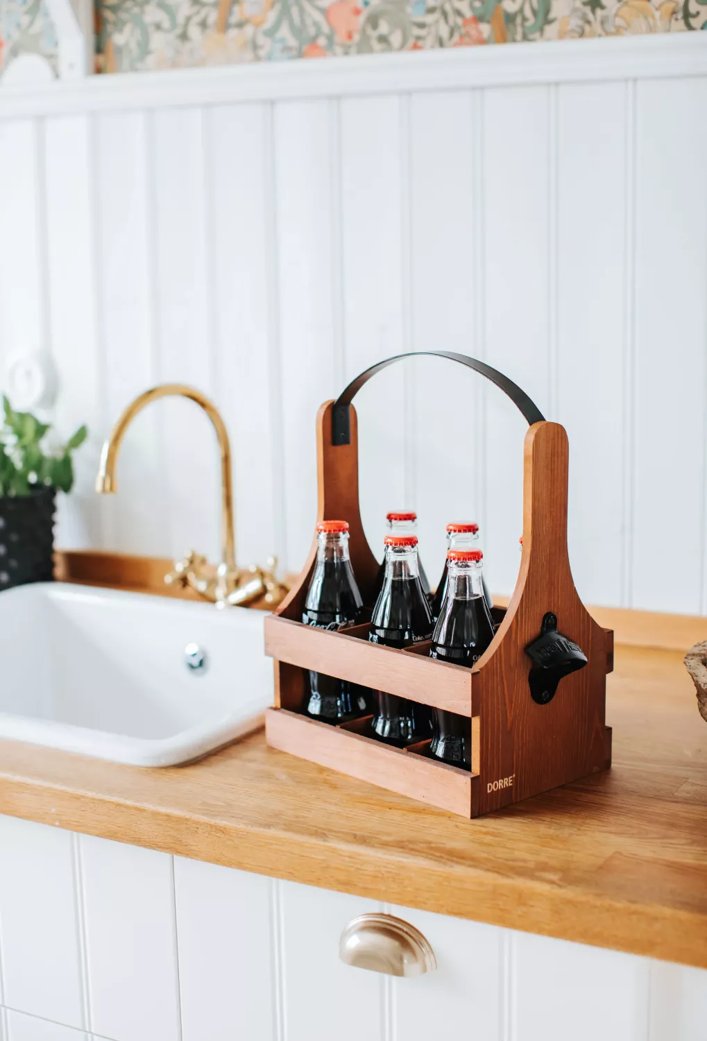 Tage flaskback – fyll med favoriter och ge bort eller servera hemma med stil. Smideshandtag och kapsylöppnare i järn på sidan.