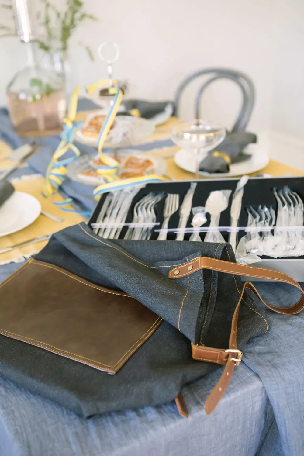 Snyggt och praktiskt jeansförkläde med ficka för redskap. Stilren, rustik design som passar alla kök. Maskintvätt 30°C. Mått: 80x70 cm.