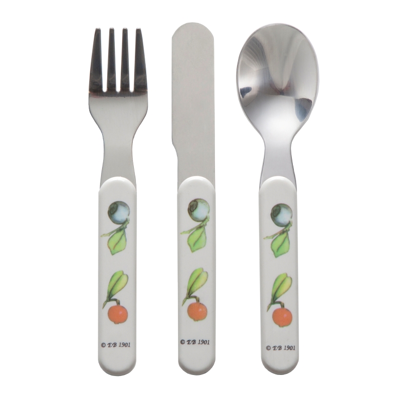 Tåliga barnbestick i plast och rostfritt stål. Kniv, gaffel och sked för små händer. Levereras i en praktisk presentkartong.