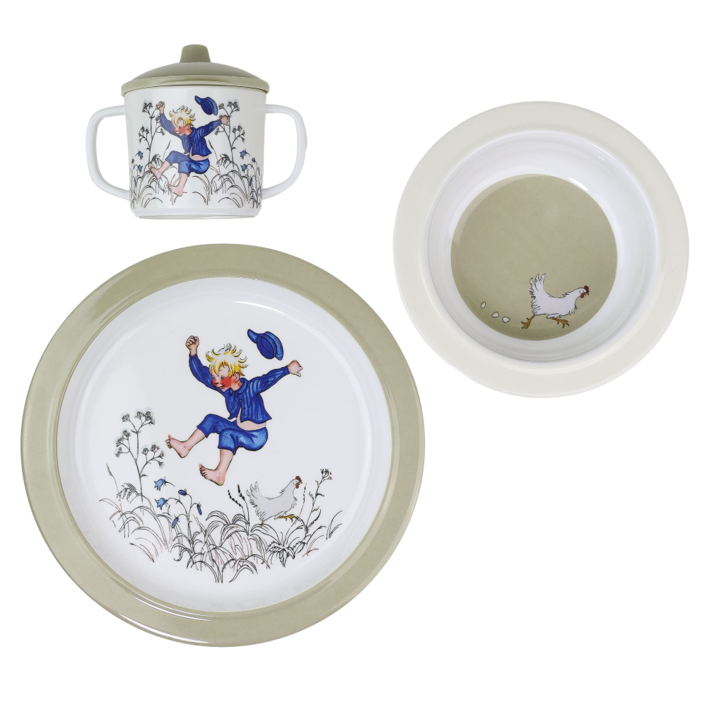 Set med pipmugg, skål och tallrik i melamin. Halkskydd undertill. Muggen har avtagbart spillsäkert lock. Tål maskindisk (ej mikro).