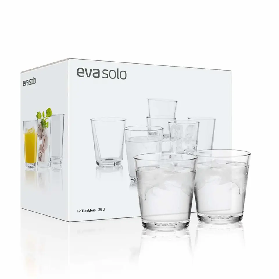 Eva Solo dricksglas 12-pack i borosilikatglas. Rymmer 25 cl. Tål värme, kyla och maskindisk. Perfekta till vardag och fest.