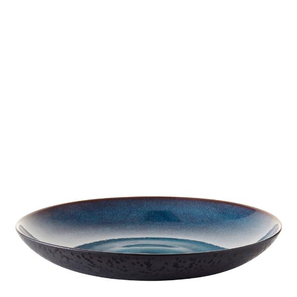 Den matta svarta utsidan kombineras med en djup mörkblå glasyr på insidan, vilket skapar en vacker kontrast och ett modernt nordiskt uttryck. Den reaktiva glasyren ger dessutom varje fat ett unikt utseende där färg och struktur varierar naturligt.