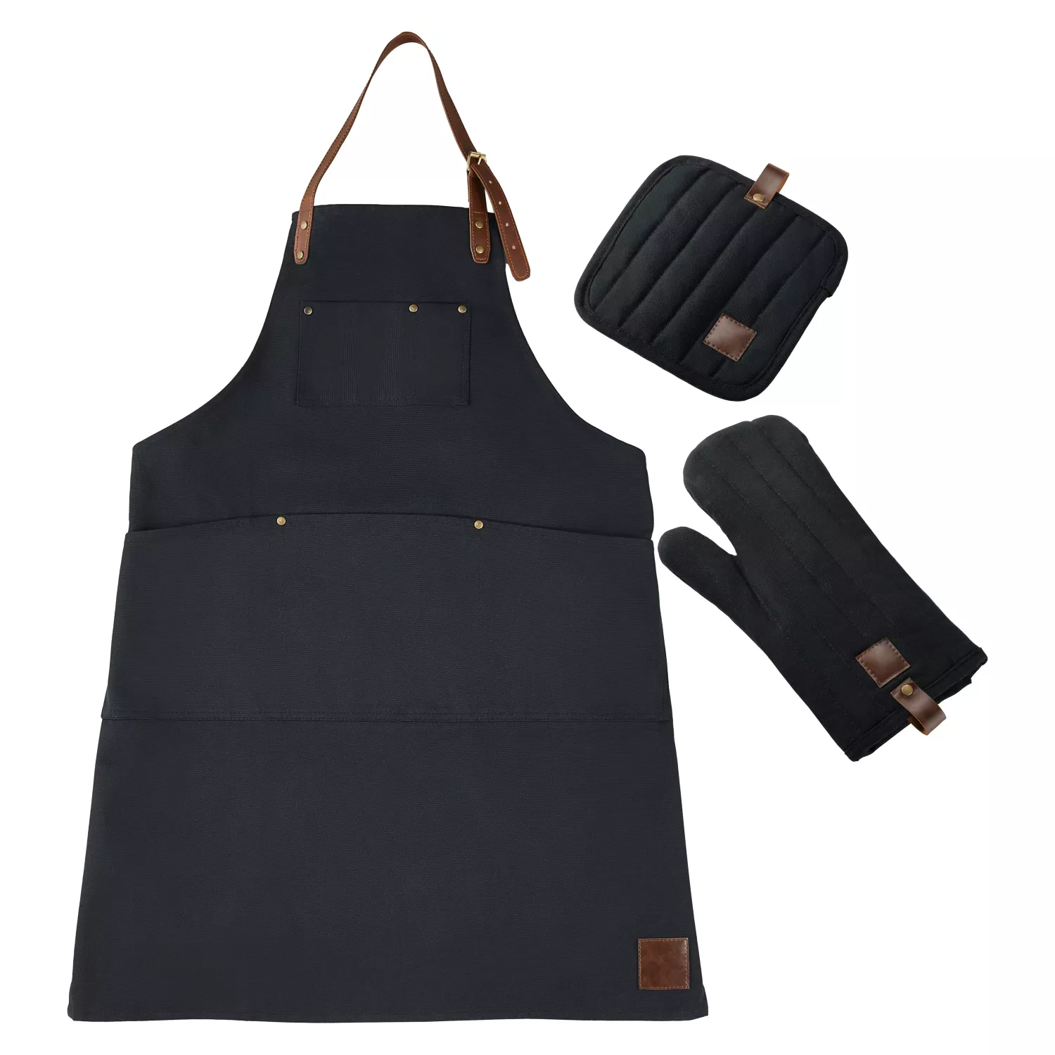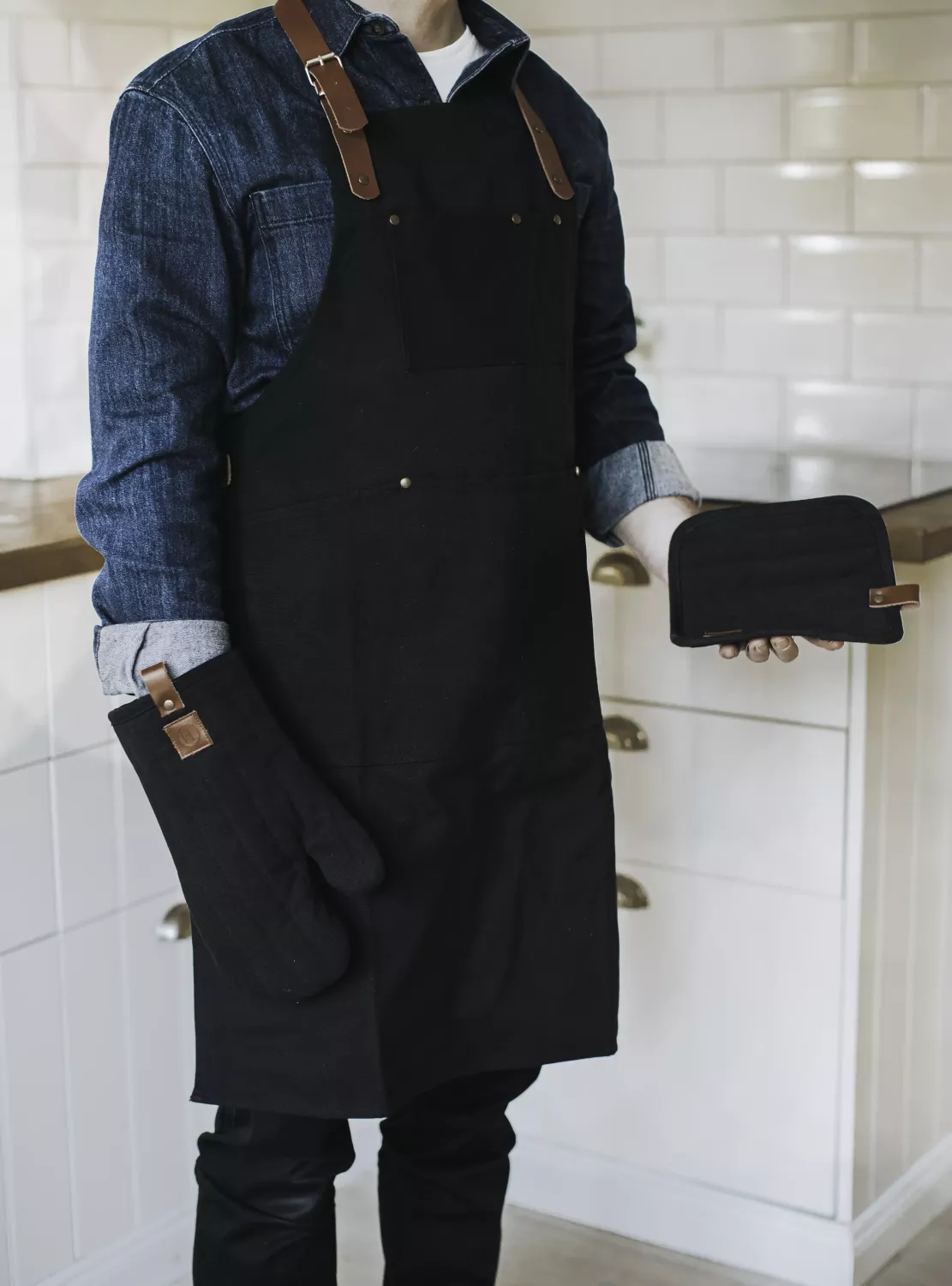 Flick Förklädesset från Dorre i grå bomull. Innehåller förkläde, grytlapp och grytvante – stilfullt och praktiskt startkit till köket.