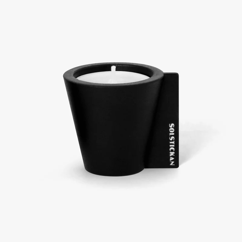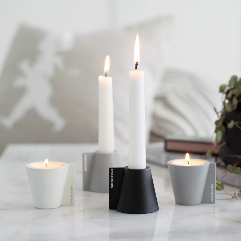 Vändbar ljushållare för kronljus och värmeljus. Pulverlackerat stål med Solstickan‑logga – snygg solo eller i grupp.