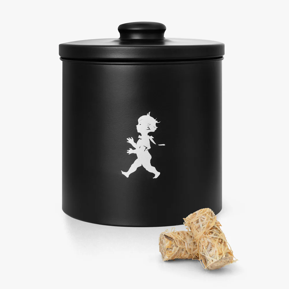 Stilren svart förvaringsburk från Solstickan. Perfekt vid spisen för tändull, stickor m.m. Silveremblem med klassiska Solstickepojken.