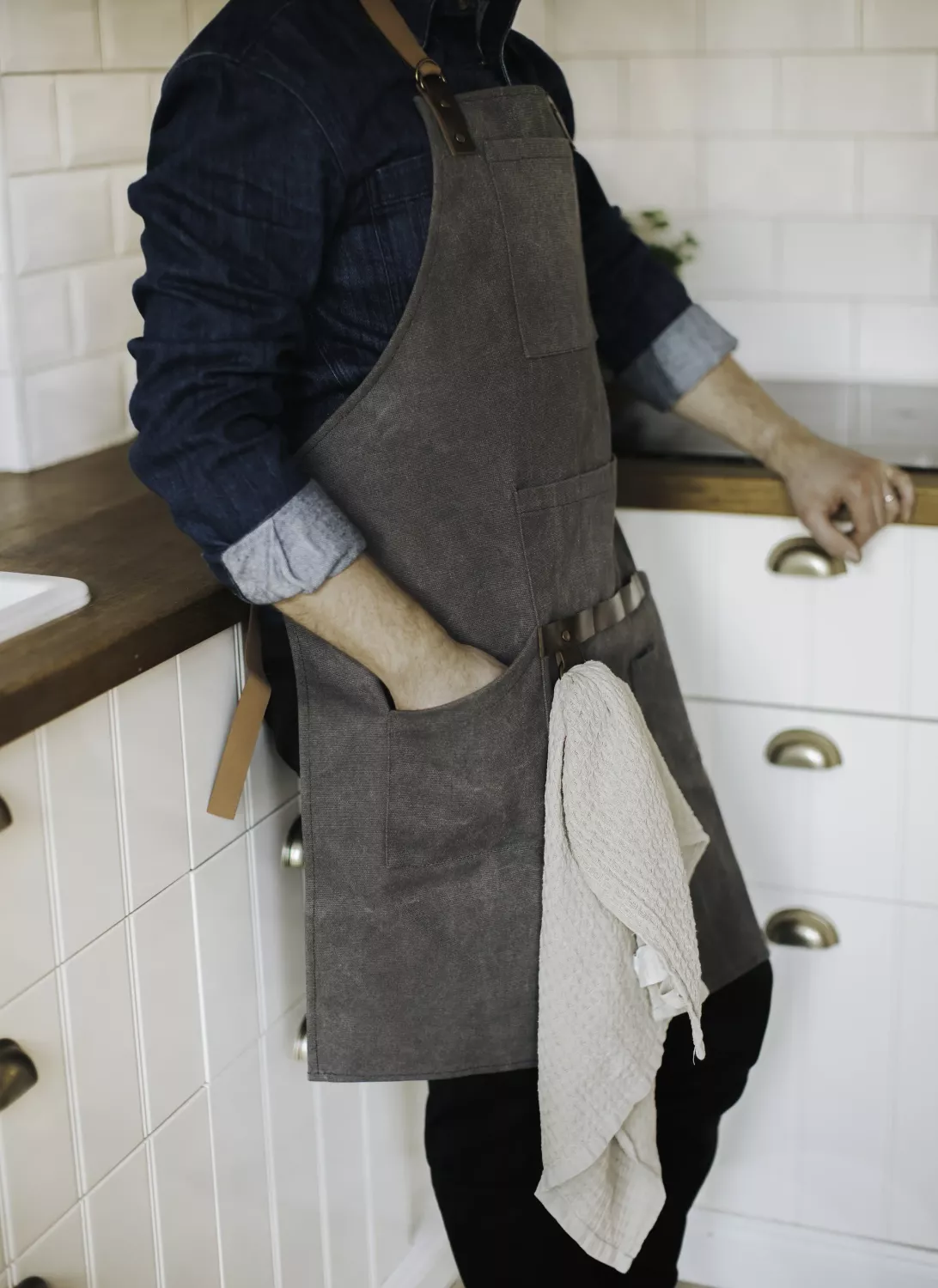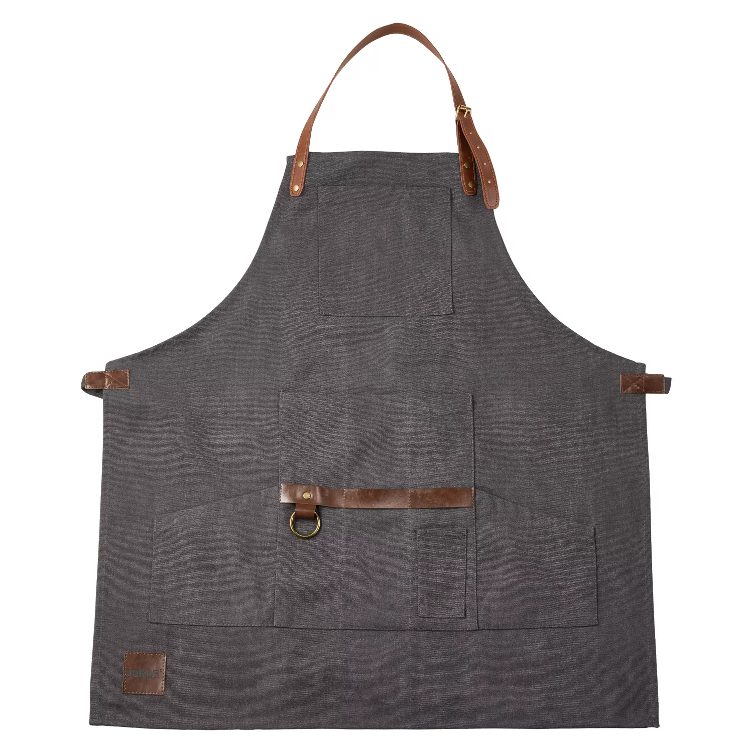 Freya Förkläde i brun canvas med fickor i PU-läder. Slitstarkt, stilrent och praktiskt. Tål maskintvätt. Storlek 83x68 cm.