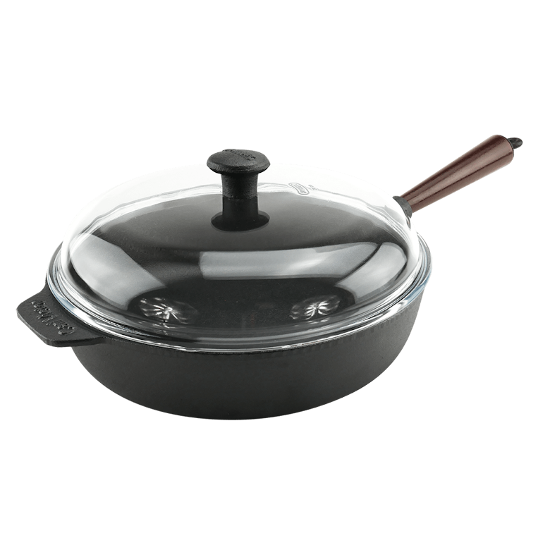 Gjutjärns traktörpanna 28 cm med Pyrex-glaslock och trähandtag – från Carl Victor