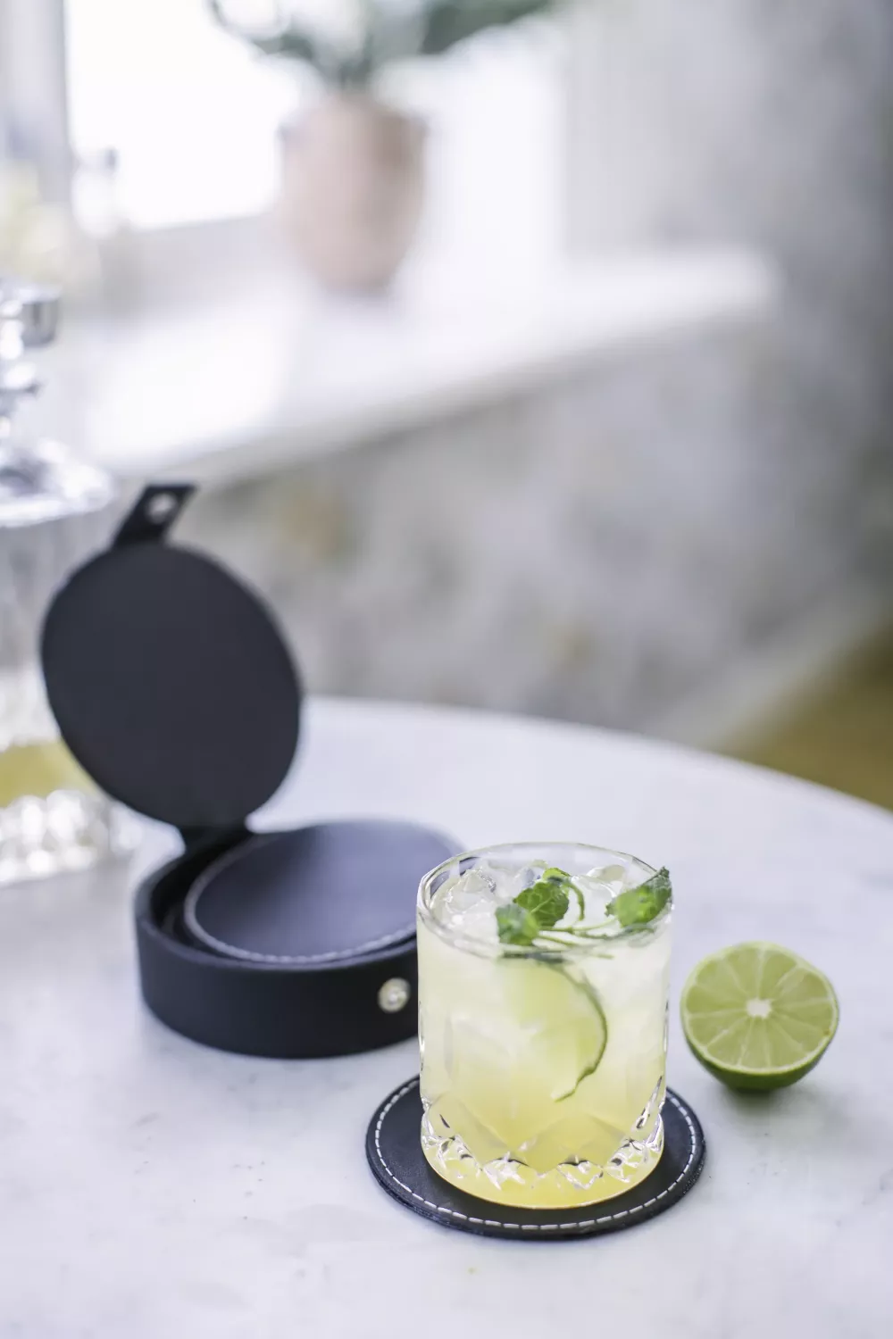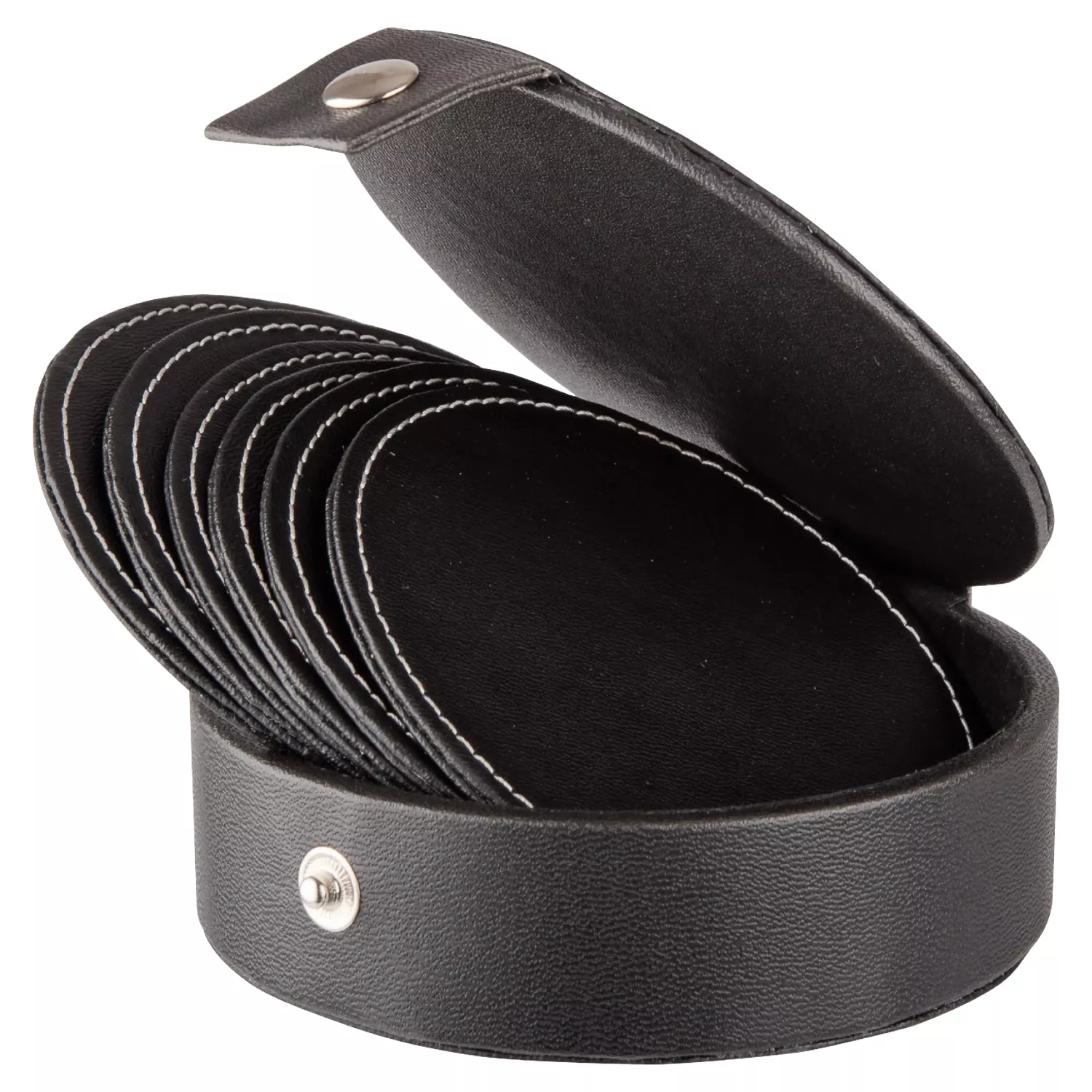 6 exklusiva glasunderlägg i konstläder – skyddar ytor och lyfter dukningen. Levereras i stilrent matchande etui.