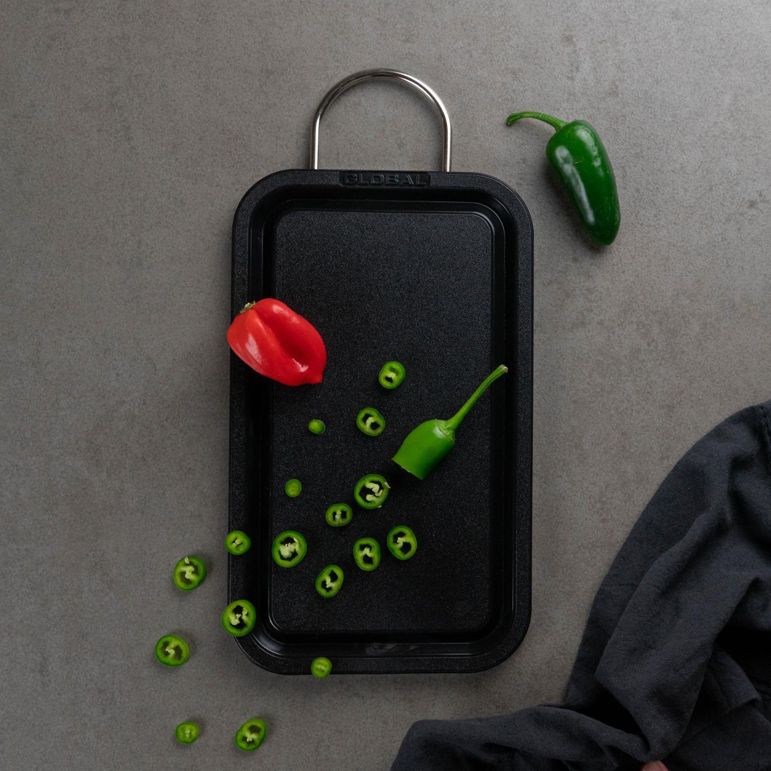 Stilrena skärbrädor från Global – i slitstark plast som är snäll mot kniven, lätt att rengöra och med blanka handtag i förnicklat stål.
