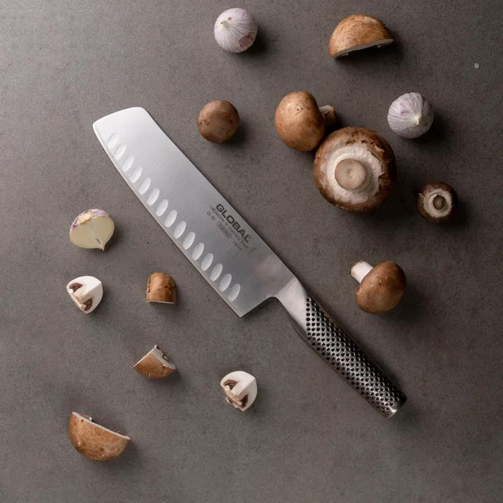 Global Classic G-80 är en olivslipad santokukniv med högt blad och rundad spets, perfekt för att skära fisk, kött och grönsaker. Namnet Santoku betyder ”tre användningar” på japanska och syftar på knivens mångsidighet i köket. Tack vare olivslipningen lossnar råvarorna lättare från bladet vid skärning.
