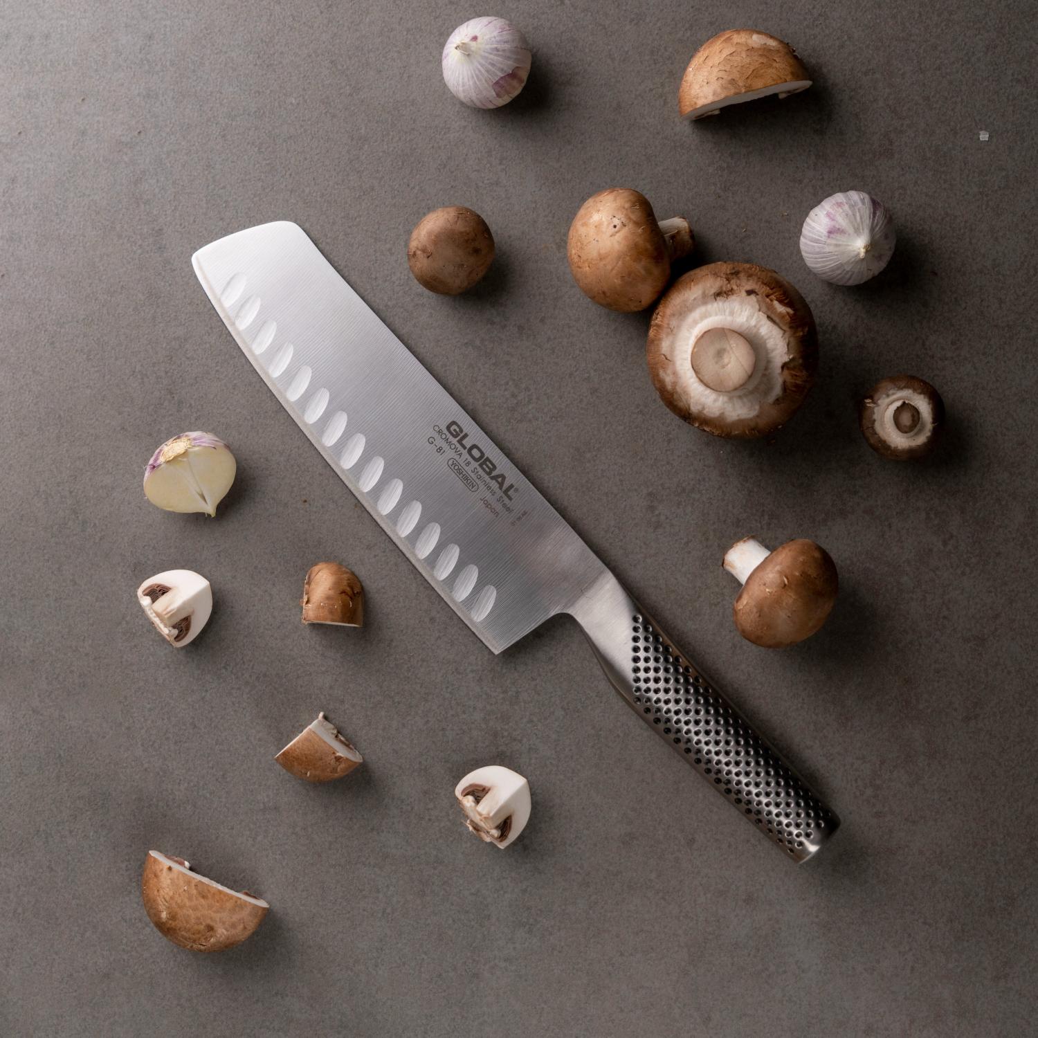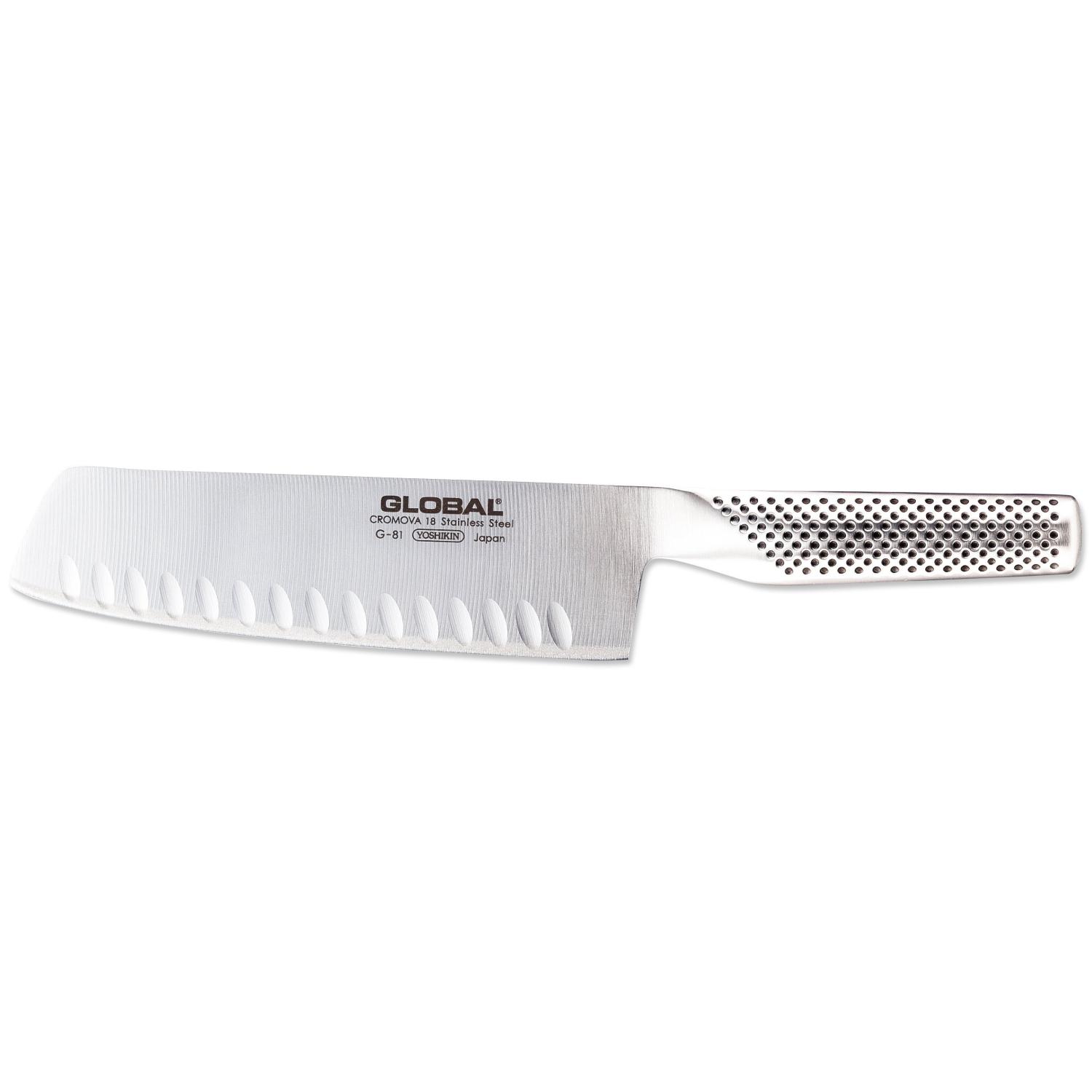 Globalkniven G-81 från Global Classic är en olivslipad grönsakskniv med högt blad och tvärt knivbladsslut och väl avvägd balans. Denna typ av kniv kallas ibland för grönsakshacka eftersom den är perfekt att hacka och skära alla typer av grönsaker med. Olivslipningen gör att livsmedlet du skär lättare släpper eggen.