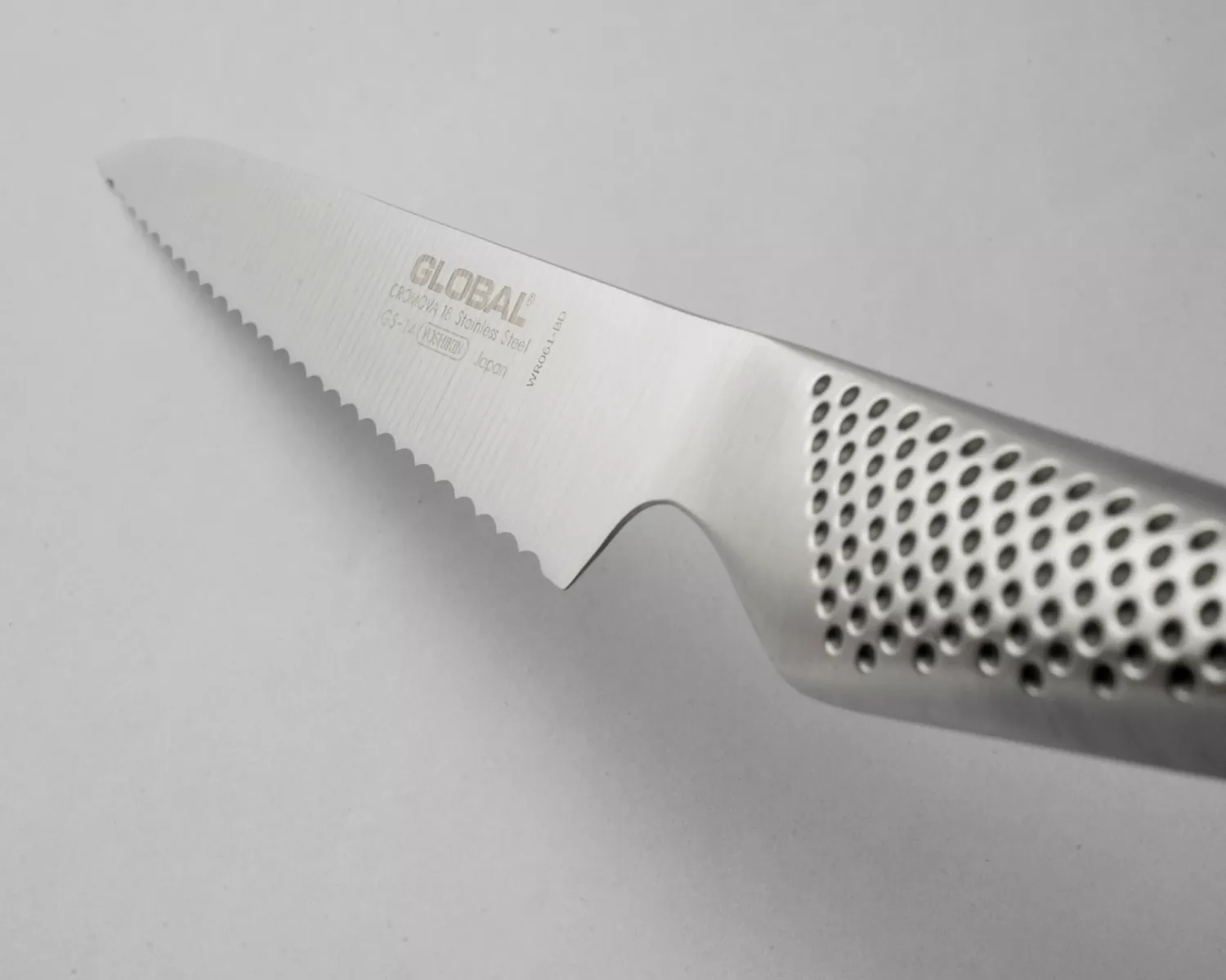 Global GS-14 allkniv vågtandad 15 cm från Global är en smidig och mångsidig kökskniv med tandad egg, perfekt för råvaror med hård yta och mjuk insida. Den vågtandade slipningen gör det enkelt att skära igenom exempelvis tomater, citrusfrukter och mindre bröd utan att trycka sönder innehållet.