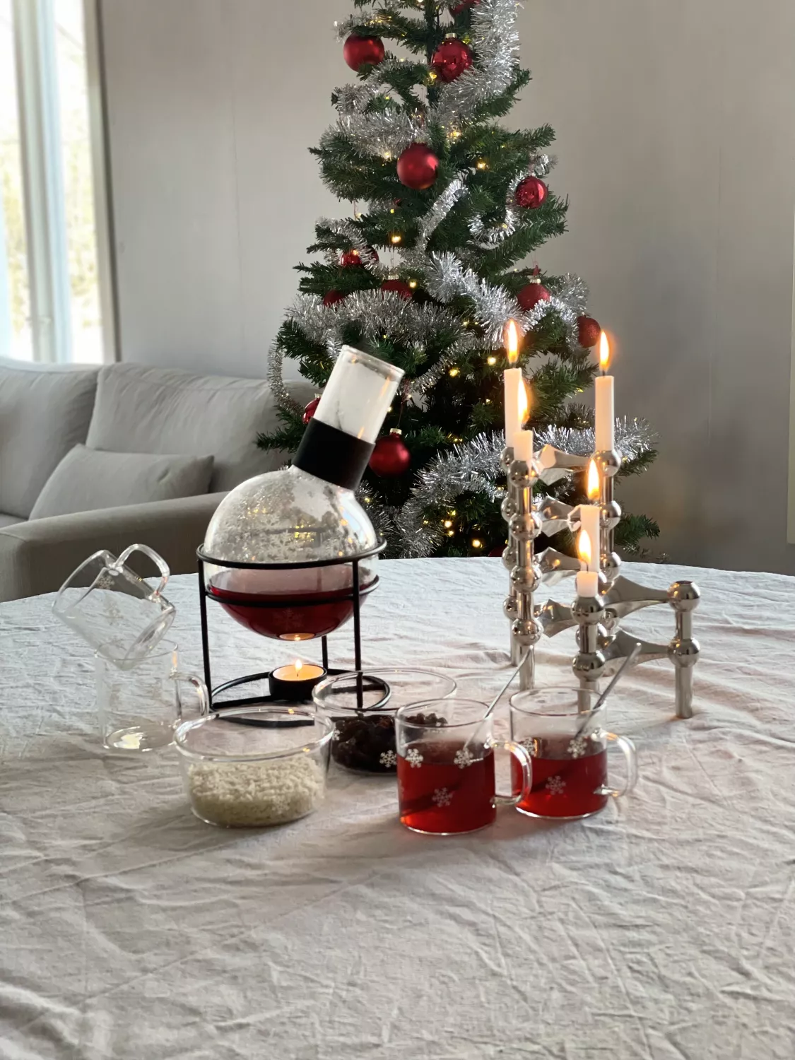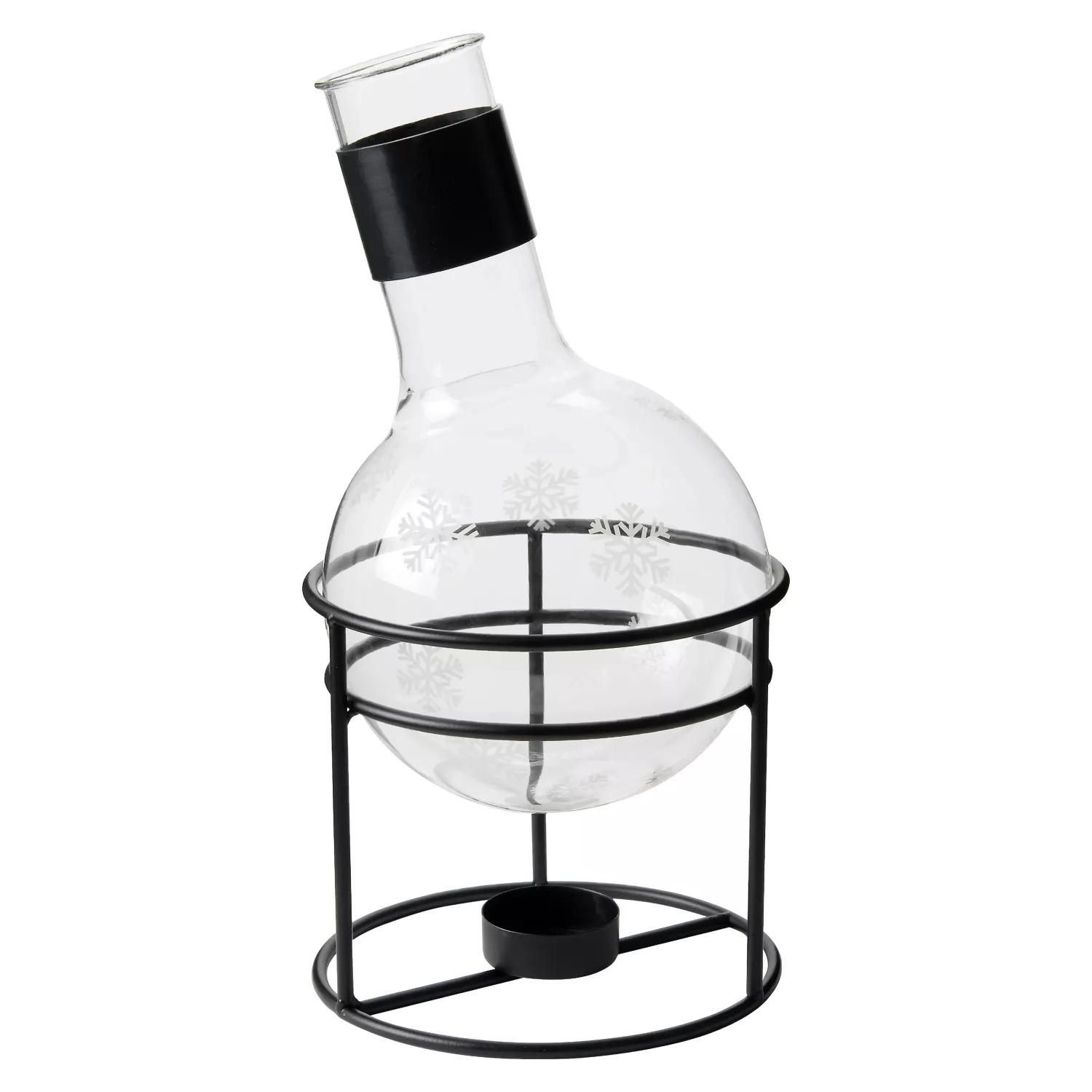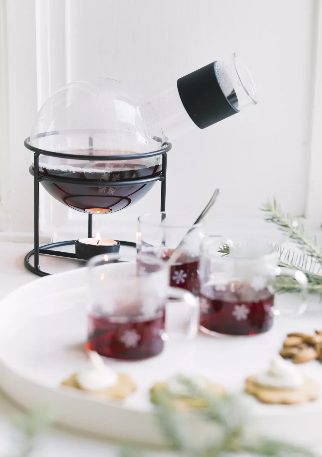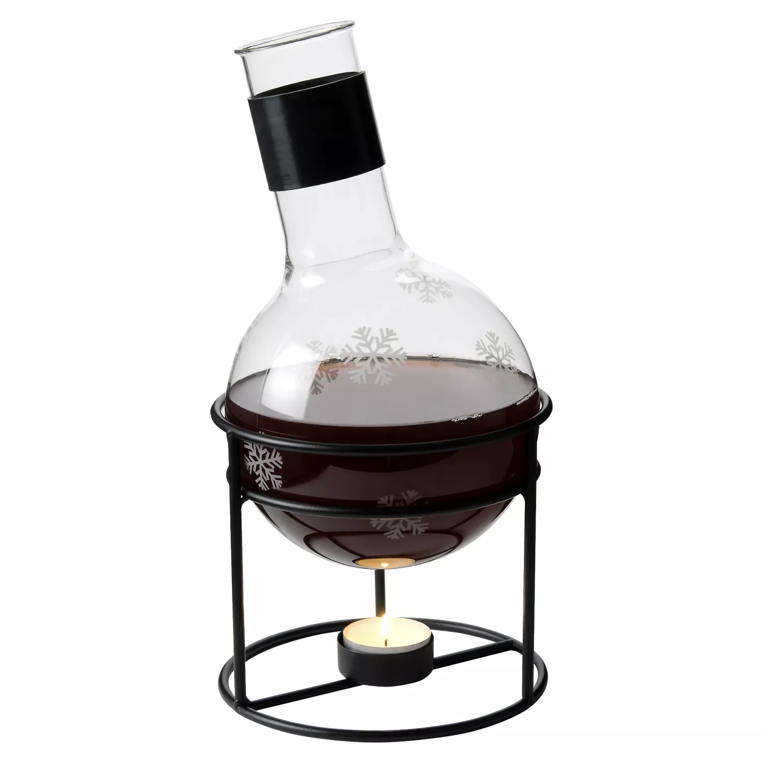 Glöggmys med stil – vacker karaff från Dorre med snöstjärnor och smidesställning som håller glöggen varm hela kvällen.