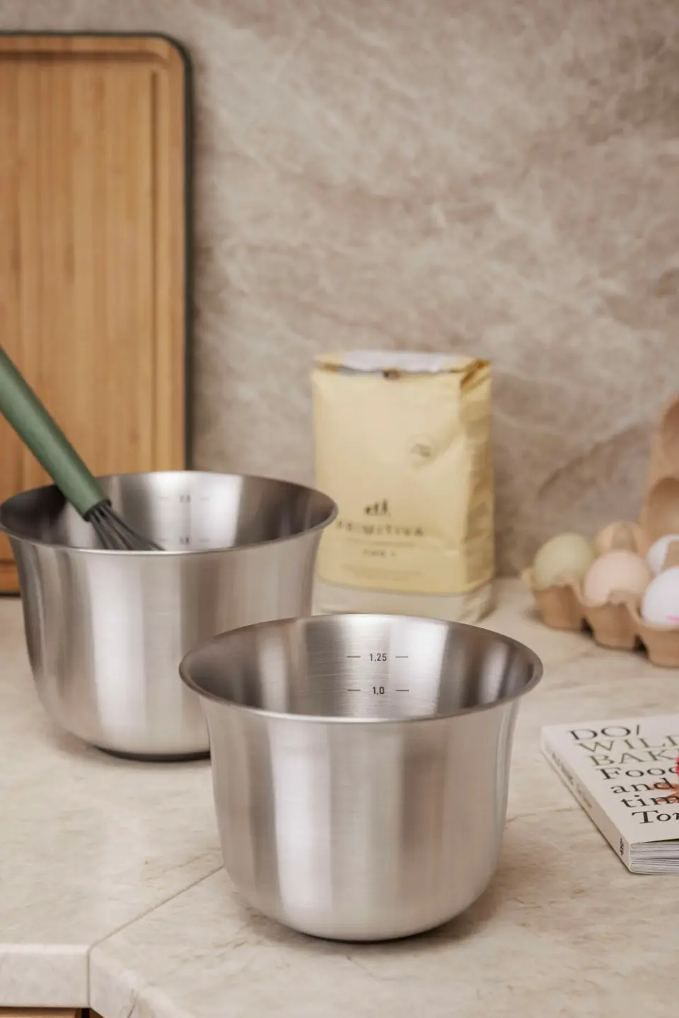 Använd blandskålen för att blanda, vända, knåda eller förvara mat. Skålen är tillverkad av 90 procent recycled post-consumer rostfritt stål, vilket gör den hållbar och motståndskraftig mot stötar, repor och bucklor. Den tål handmixer, visp och andra metallredskap utan problem. En gummiring i botten säkerställer att skålen står stadigt på bänken. Med sin rundade botten och sina höga kanter är skålen perfekt för vispning, och dess förmåga att motstå både höga och låga temperaturer gör att den lämpar sig väl för vattenbad och nedkylning av ingredienser. Rostfritt stål reagerar inte med sura eller basiska livsmedel, vilket gör skålen optimal till förvaring av mat. Invändiga måttmarkeringar gör det enkelt att mäta upp ingredienser direkt i skålen, som dessutom kan staplas för att spara plats i kylskåpet och tål maskindisk.