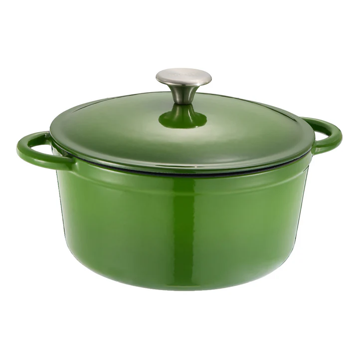Insidan är emaljerad för enkel rengöring och gör det möjligt att förvara maten direkt i grytan utan att den tar smak. Locket har en elegant knop i rostfritt stål som tål höga temperaturer – så du kan utan problem flytta grytan mellan spis och ugn.