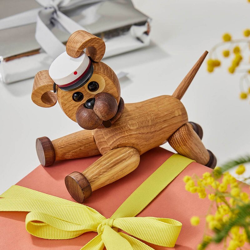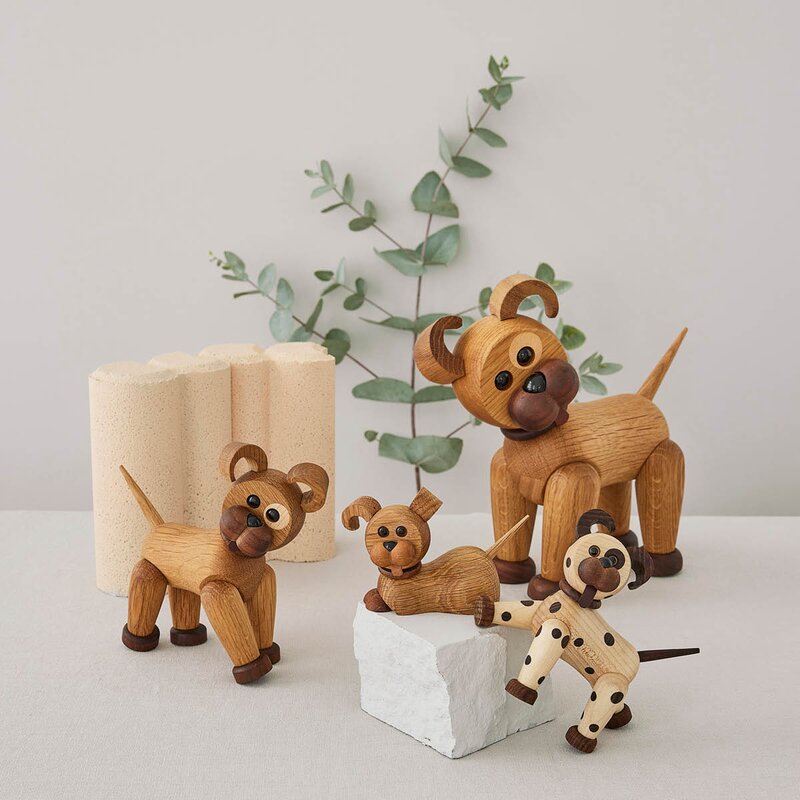 Hunden Happy är en charmig träfigur designad av Chresten Sommer och inspirerad av den klassiska danska traditionen att skapa träfigurer med karaktär och personlighet. Figuren består av 31 rörliga delar som gör att hunden kan sitta, stå eller ligga och därmed skapa olika uttryck. Happy är tillverkad av FSC-märkt ek, valnöt och ask och har en liten tunga i ekologiskt läder som ger figuren extra charm. Den stilrena designen gör att den passar lika bra som dekorativ inredning som i en samling av nordiska träfigurer. En lekfull och tidlös detalj som sprider glädje i hemmet.