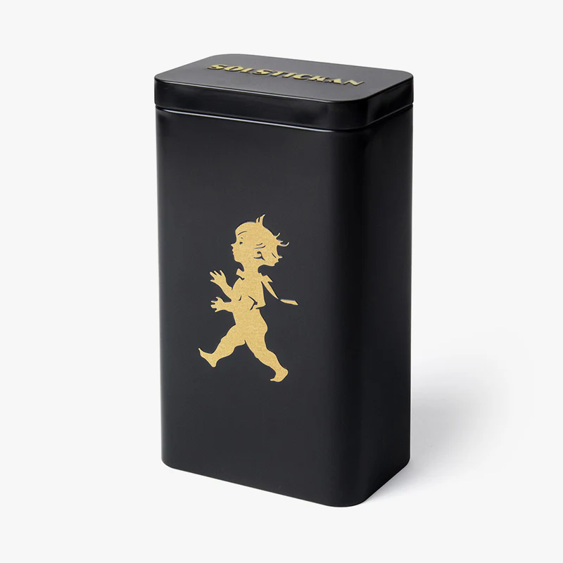 Solstickan kaffeburk i plåt – sväljer svenska kaffepaket, kapslar eller te. Klassiska pojken från 1936 pryder burken, snygg på bänken.