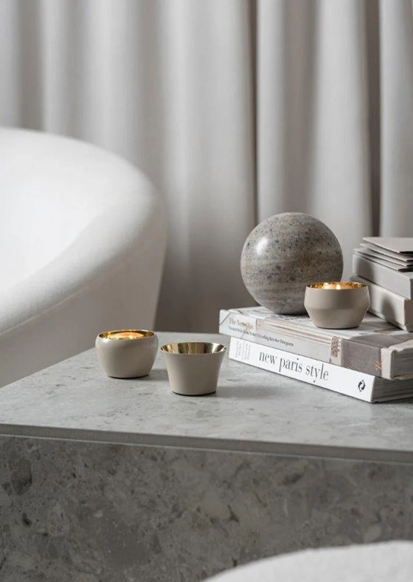 Kin ljushållare – Claesson Koivisto Rune för Skultuna. Beige pulverlack ute, blank mässing inne. Modern klassiker sedan 2010.