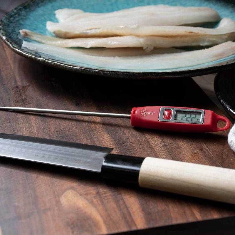 En prisvärd allroundtermometer som inom sekunder visar aktuell temperatur. Oumbärlig när du måste ha exakt koll på temperaturen för att få perfekt resultat. Termometern fungerar precis lika bra till steken, fiskn och frityroljan som till vinet, vällingen eller till exempel degvätskan.