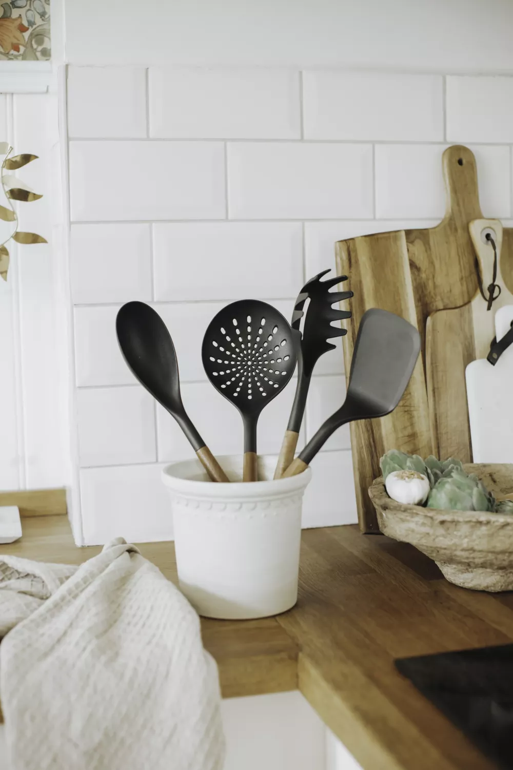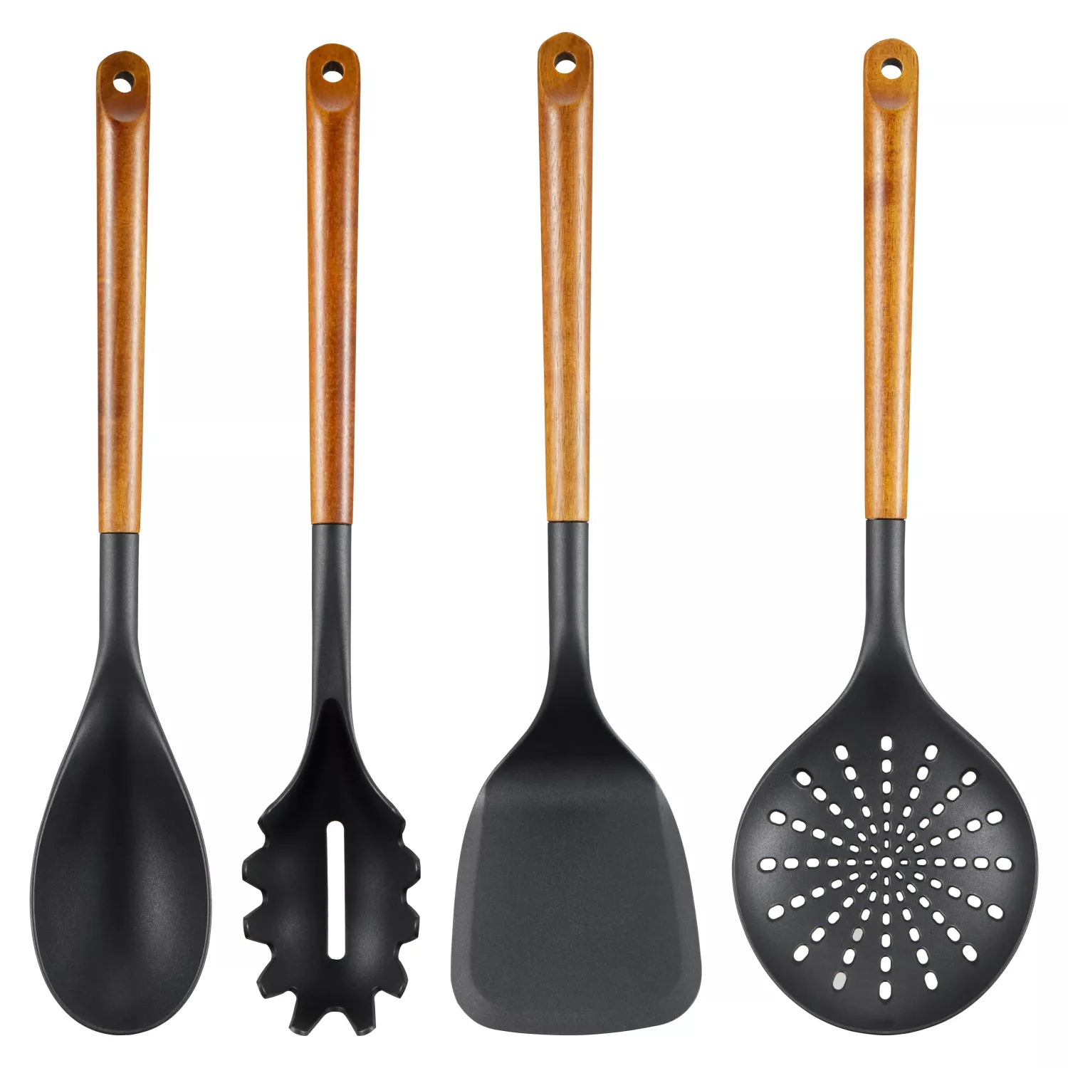 Korra köksredskap 4-pack med handtag i akaciaträ. Innehåller slevar, pastaslev och stekspade – både praktiska och snygga på bänken.