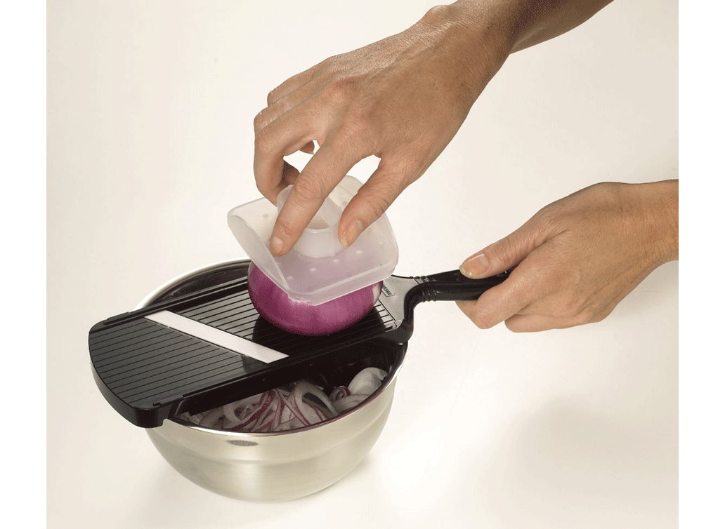 Prisbelönad mandolin som blivit bäst i test i både Icakuriren, Allt om mat och Aftonbladet. Enkel att använda – ställ bara in önskad tjocklek från 0,5 mm till 3 mm. Skivar lök och alla andra grönsaker och rotfrukter.