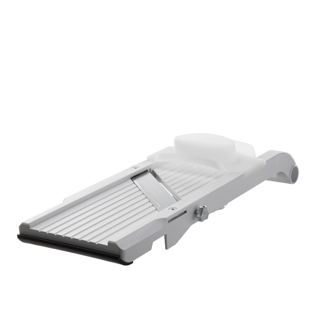 Benriner mandolin med steglös inställning 0,5–10 mm. Handslipat blad och 3 utbytbara strimlingsblad. Glidskydd och fingerskydd ingår.