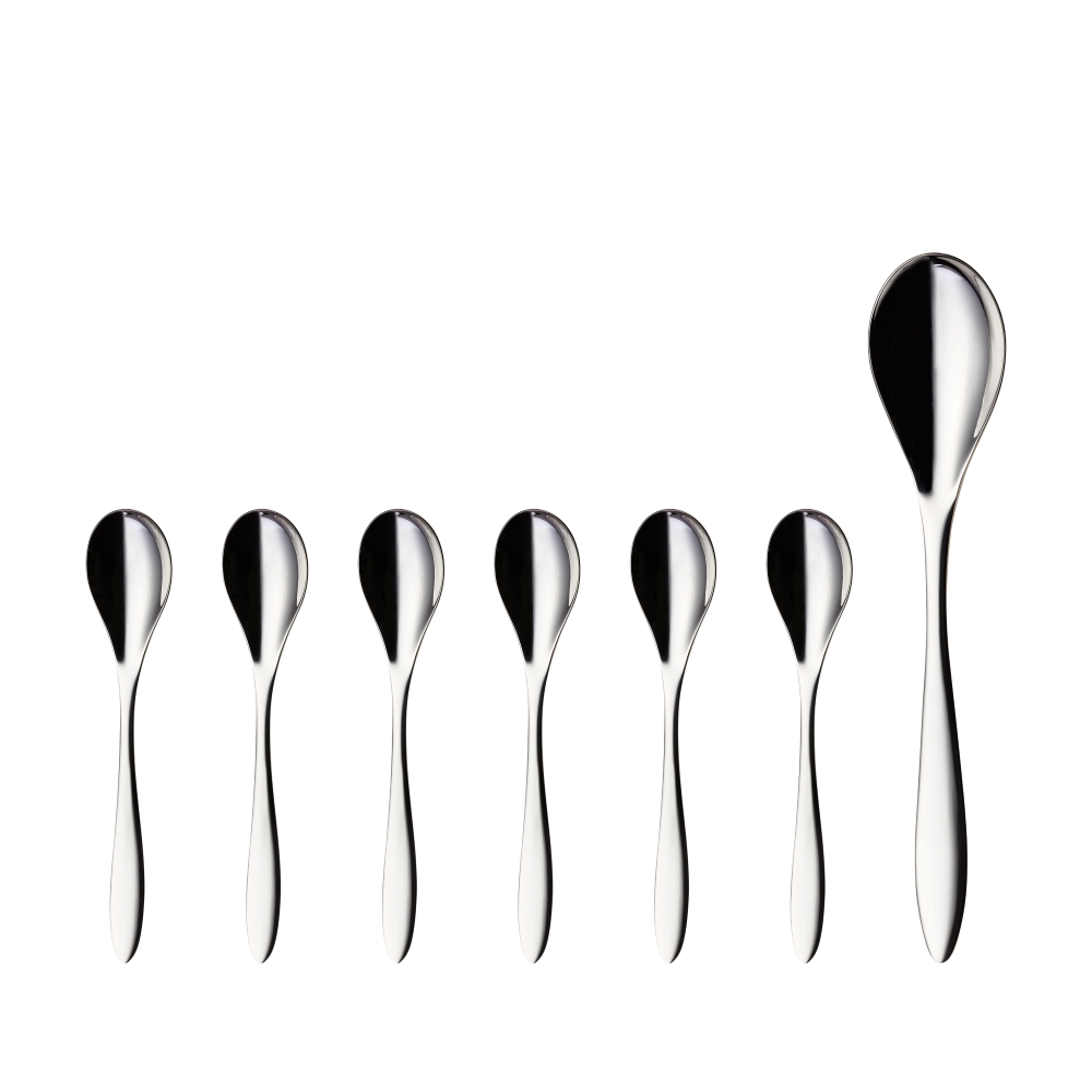 Maria dessertset i 7 delar från Hardanger Bestikk, designad av Odd Leikvoll 2014. Enkel och naturinspirerad serie med bekväma och eleganta skedar.
