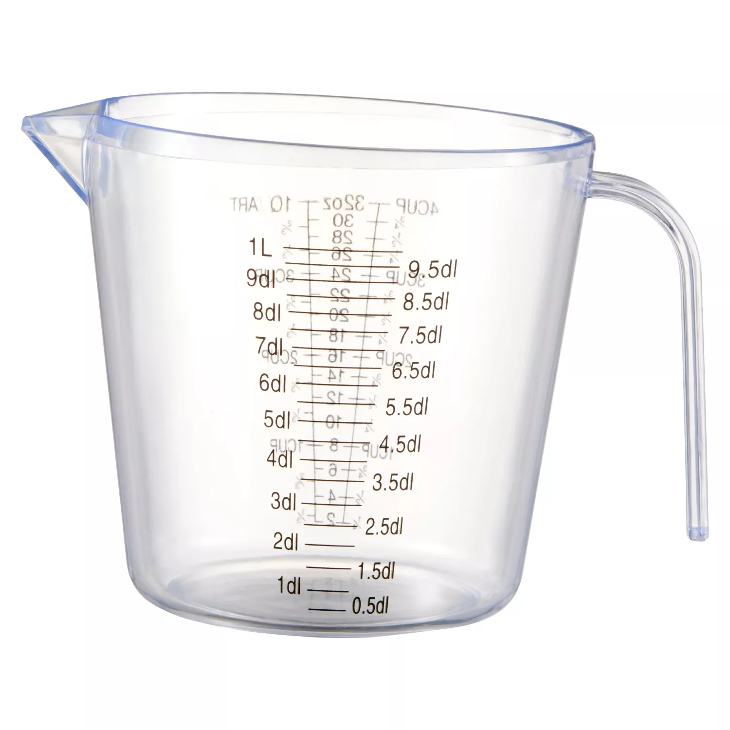 Tålig och stapelbar måttbägare i plast – 1 liter, med tydliga måttmarkeringar.