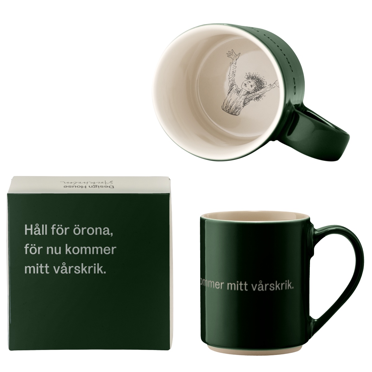 Grön mugg med humoristisk text: "Håll för örona när jag pratar med dig". En personlig favoritmugg med plats för 35 cl dryck.