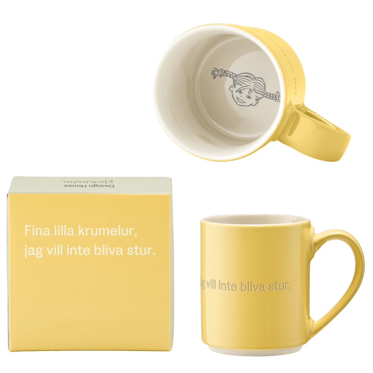 Gul mugg med lekfull text: "Fina lilla krumelu". En värmande och charmig kopp för kaffe, te eller choklad – 35 cl.