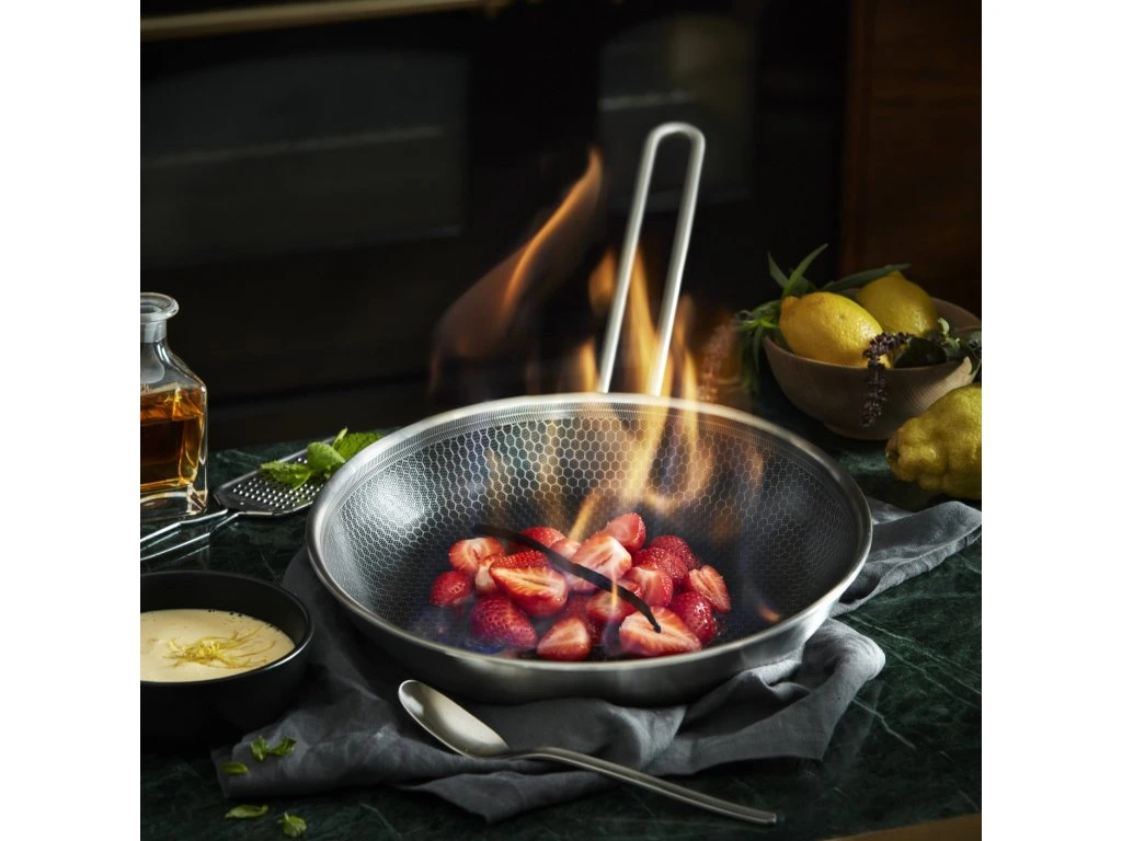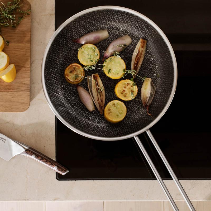 Stekpannans trelagsteknologi ger optimal värmespridning, och den hårda, slitstarka utsidan tål frekvent användning. Använd pannan till allt från stekta ägg till pannbiffar och vegetariska burgare. Stekpannan klarar även en vända i ugnen på upp till 400 °C och är lämplig för alla värmekällor, inklusive induktion.