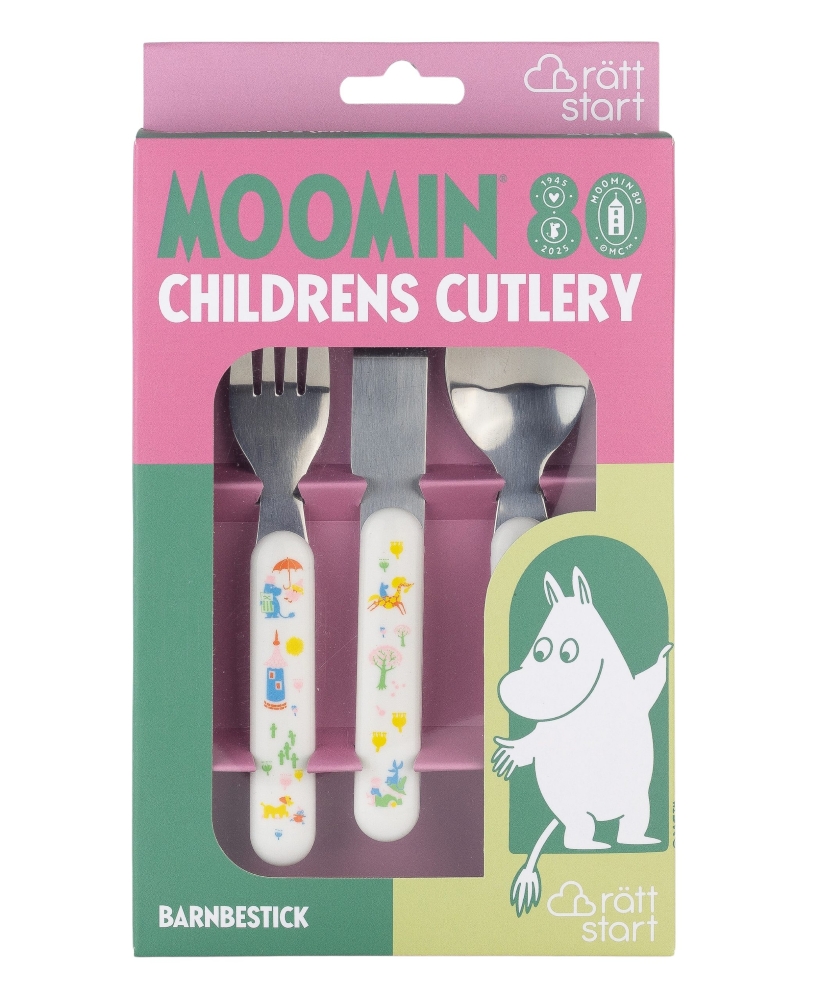Mumin 80 bestickset från Rätt Start med kniv, gaffel och sked i tålig plast och rostfritt stål. Perfekt för små händer och som present.