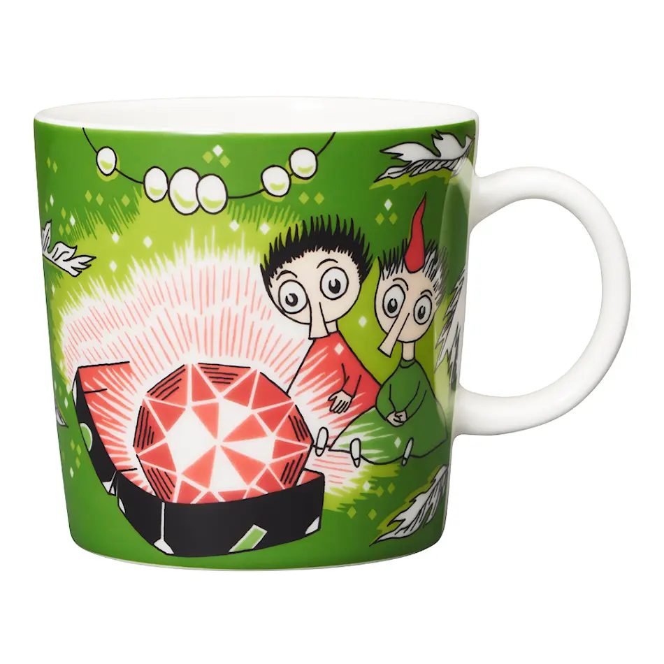 Motivet på muggen visar Tofslan & Vifslan som gömmer Kungsrubinen i sin resväska och flyr till Mumindalen, där Muminmamman välkomnar dem.