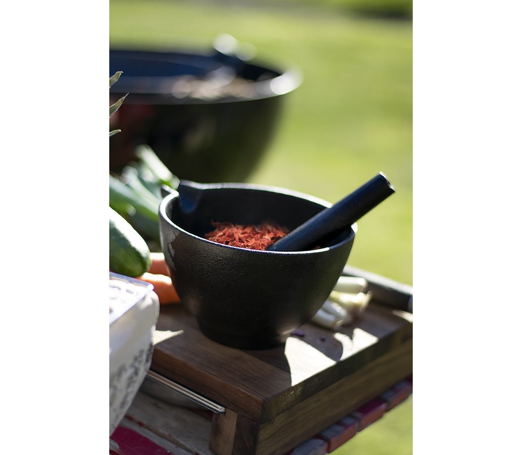 Satake Nabe gjutjärnsmortel är en riktigt rejäl mortel som hjälper dig att stöta färska kryddor, skapa helt egna kryddblandningar och mycket annat. Morteln är av hög kvalitet och med en stöt som ligger bra i handen. Morteln har också en praktisk pip för enklare hantering.