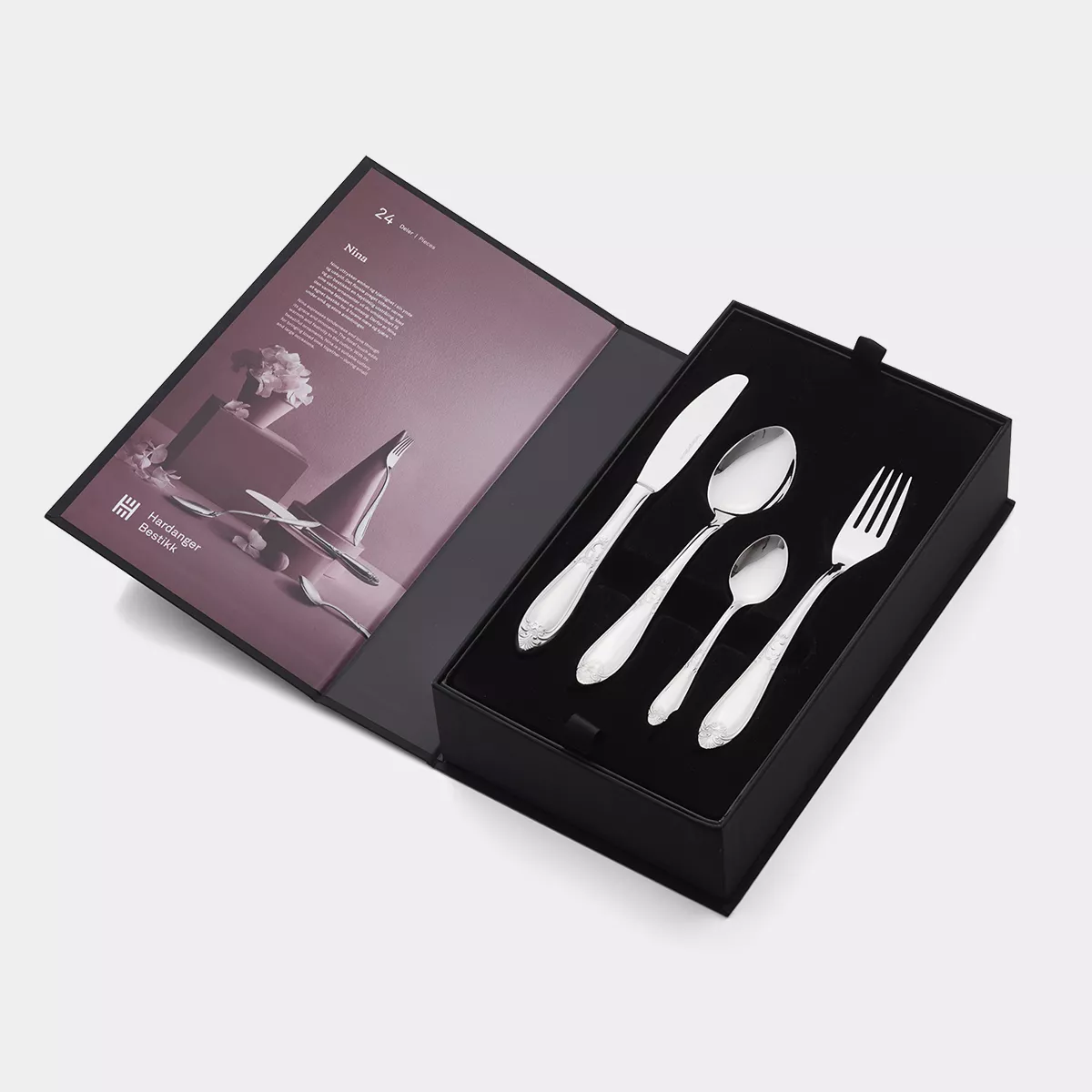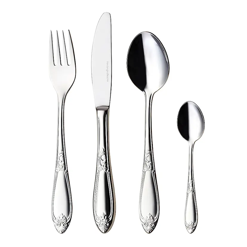 Nina bestickset 24 delar – romantisk design med blomdetaljer i rostfritt stål. Förgyll dukningen i sommarstugan eller hemma.
